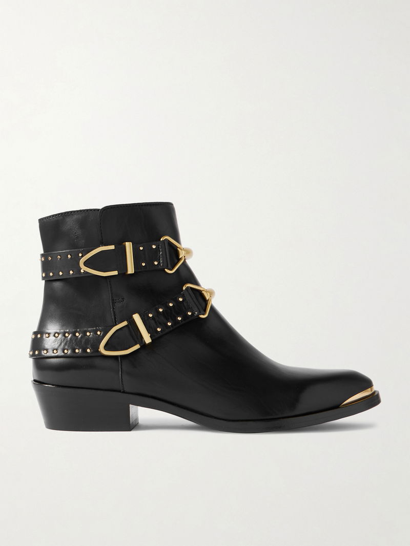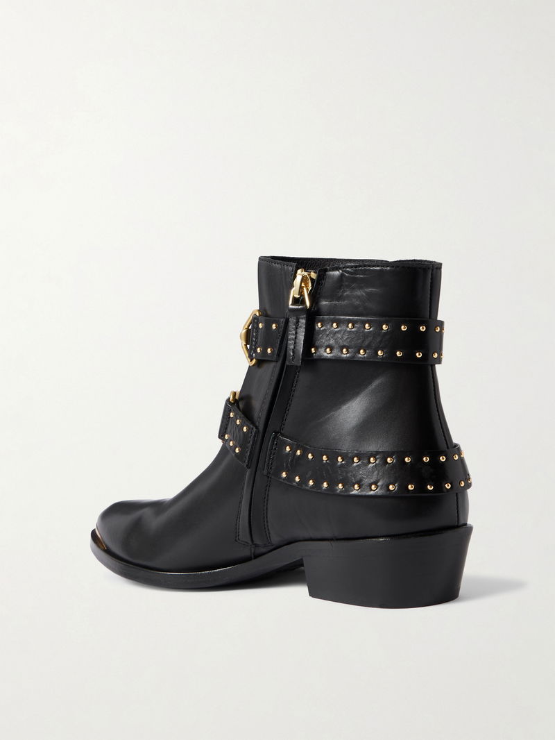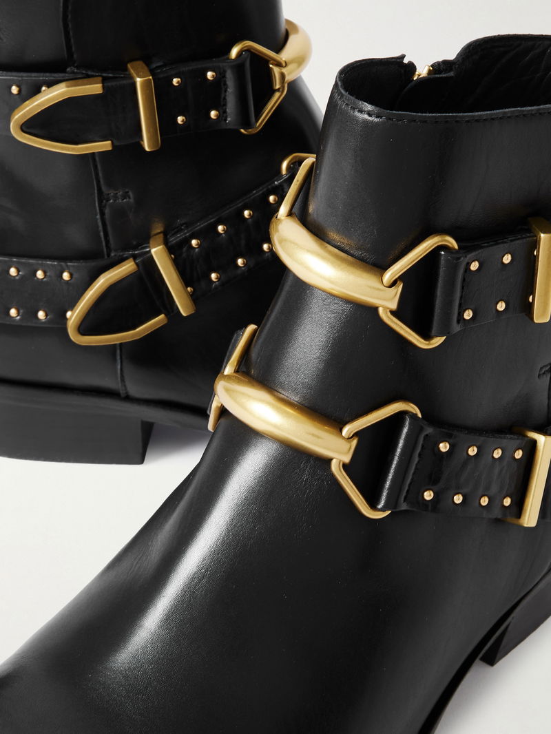 They're made from soft leather and have polished gold-tone hardware, including studs, buckled and toe caps.