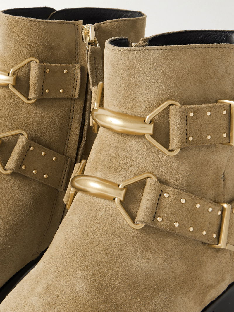 They're made from soft suede and have polished gold-tone hardware, including studs, buckles and toe caps.