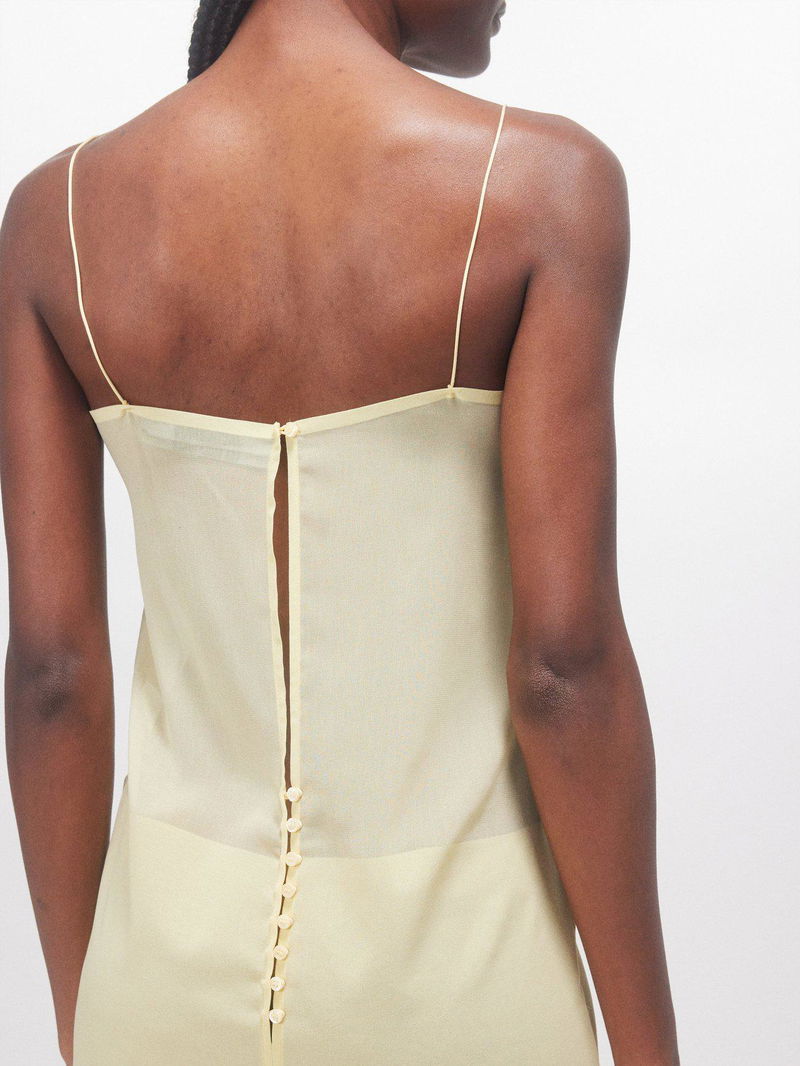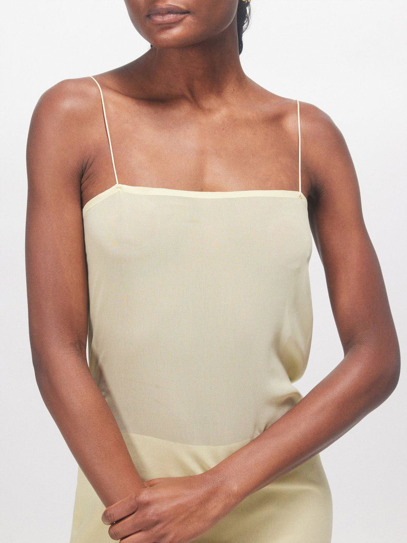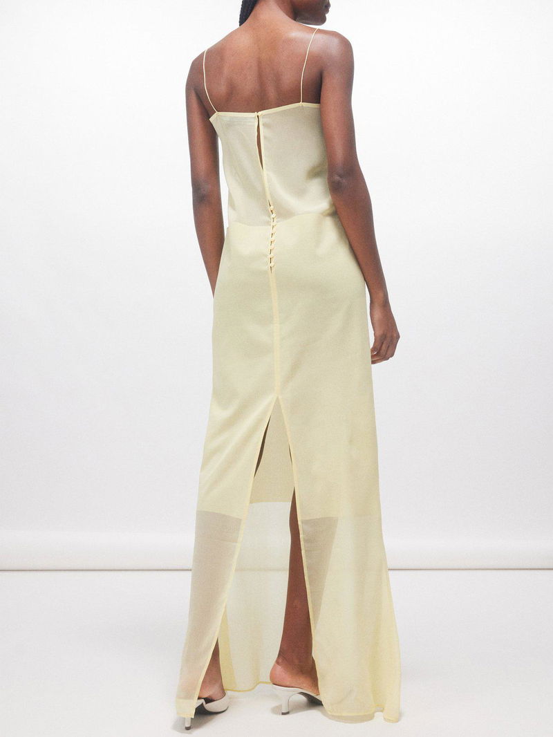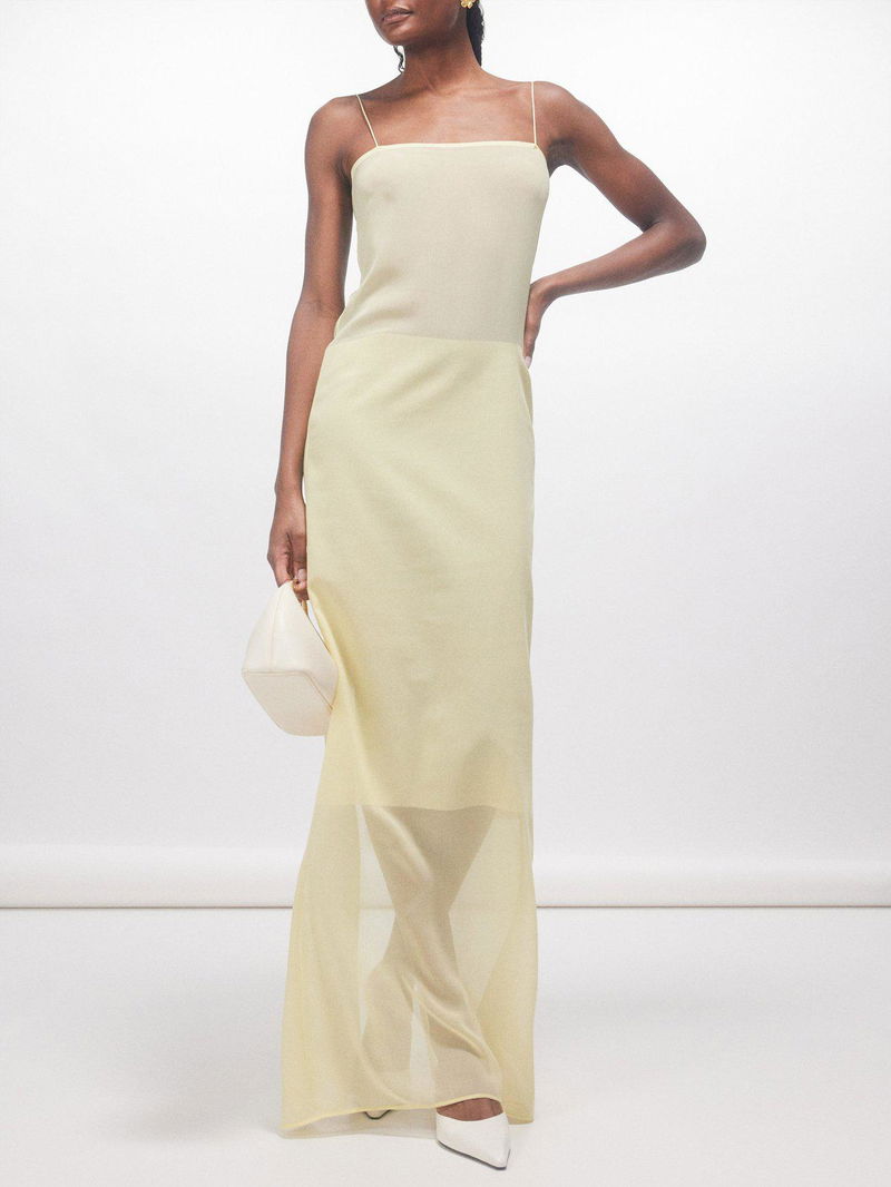 Presented on Jacquemus’ SS24 runway, this yellow Brezza maxi dress highlights the label’s contemporary take on minimalism through the juxtaposing of sheer and opaque mousseline panels.