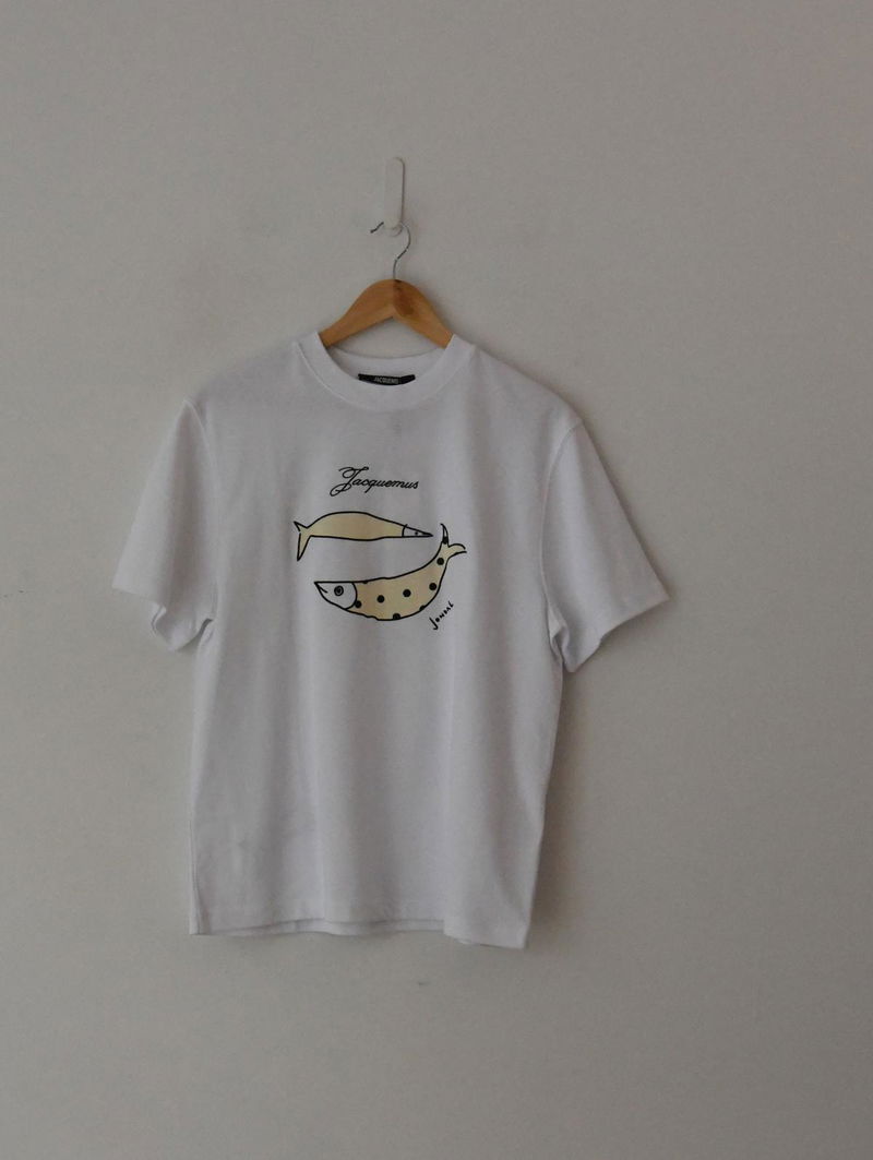 Short-sleeved t-shirt. Classic cut and Ribbed crew neck. JACQUEMUS logo embroidered on front. JONDAL logo and fishes embroidered on front and back,