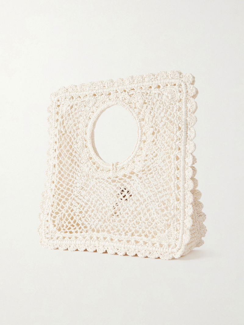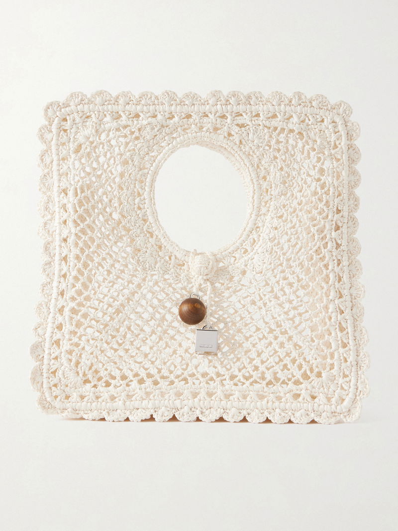 Jacquemus' 'La Spiagga' is crocheted from lace raffia in a square shape, contrasting so perfectly with the circular handle. Sized for your sunnies and cardholder, it's decorated with a couple of charms, a wooden sphere and the brand's'Rond-Carré' lock.