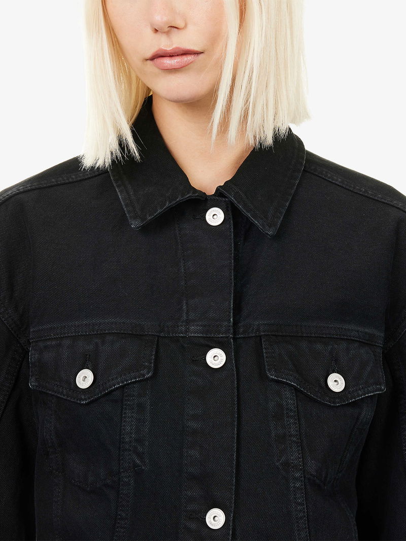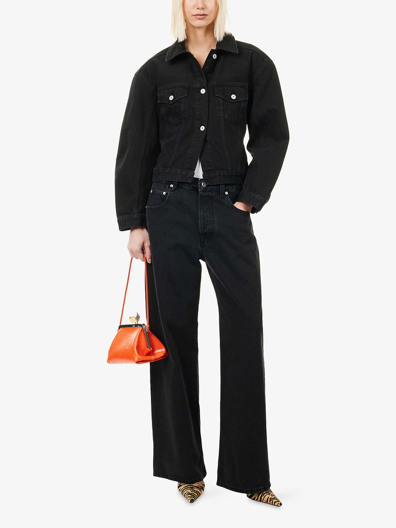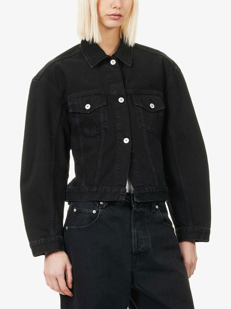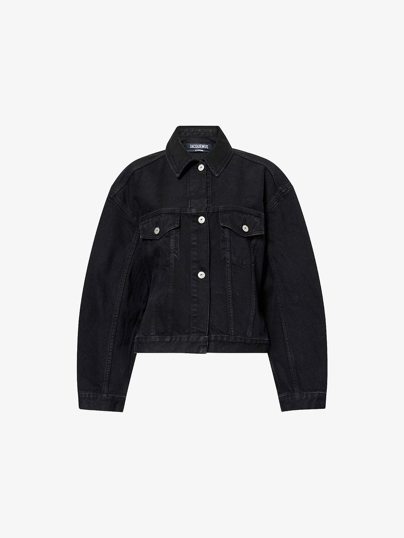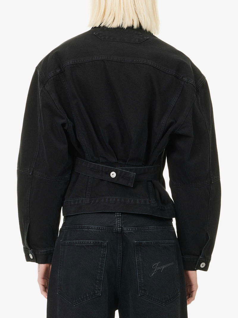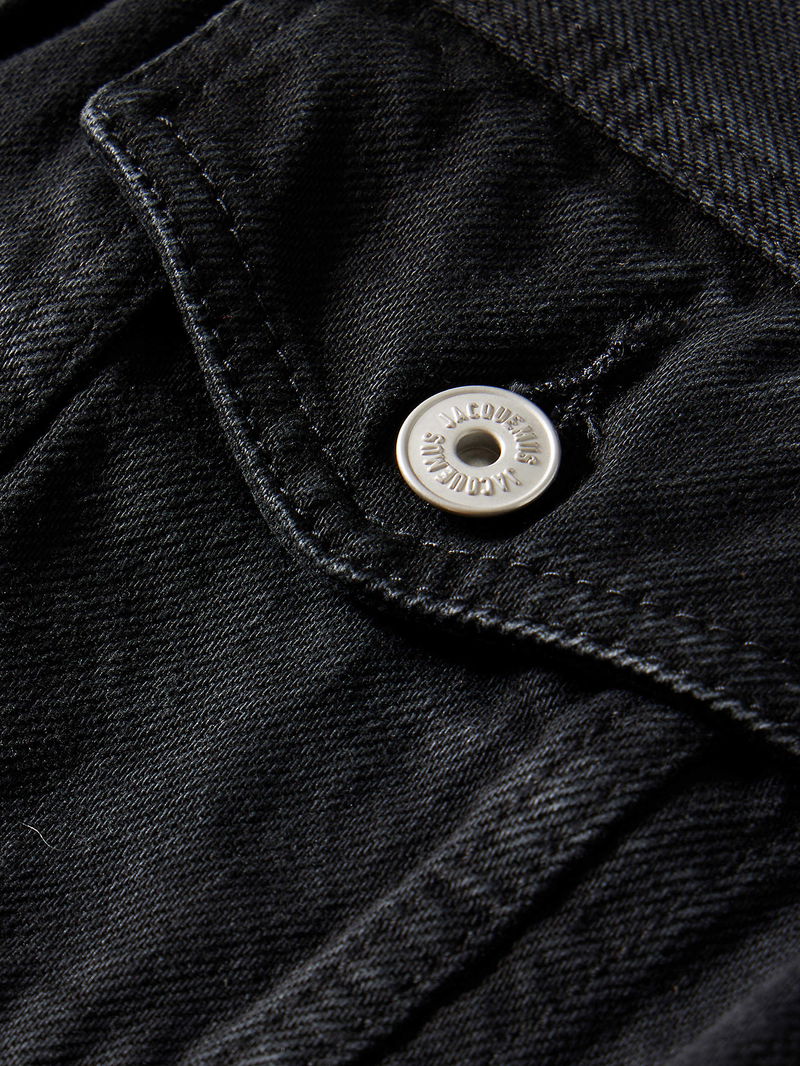 Jacquemus denim jacket. Exposed button fastening at front. Regular fit, spread-collar, long sleeves, buttoned cuffs, two buttoned pockets at front, gathered and buttoned martingale at back.