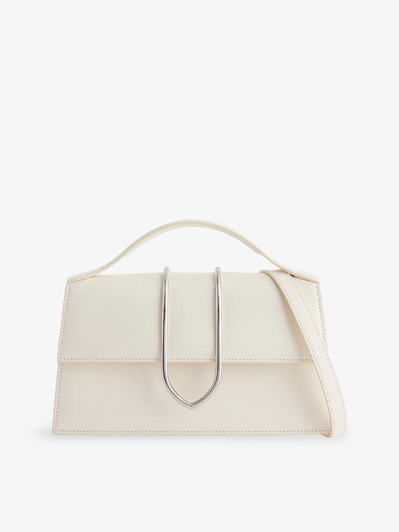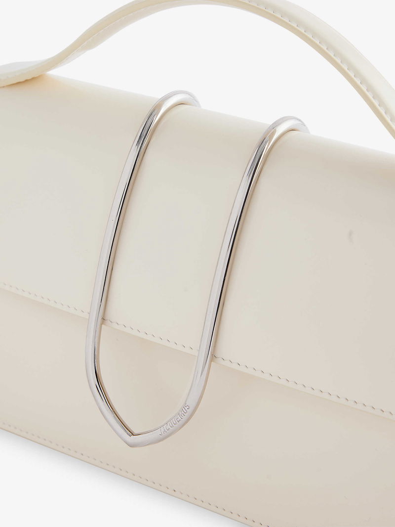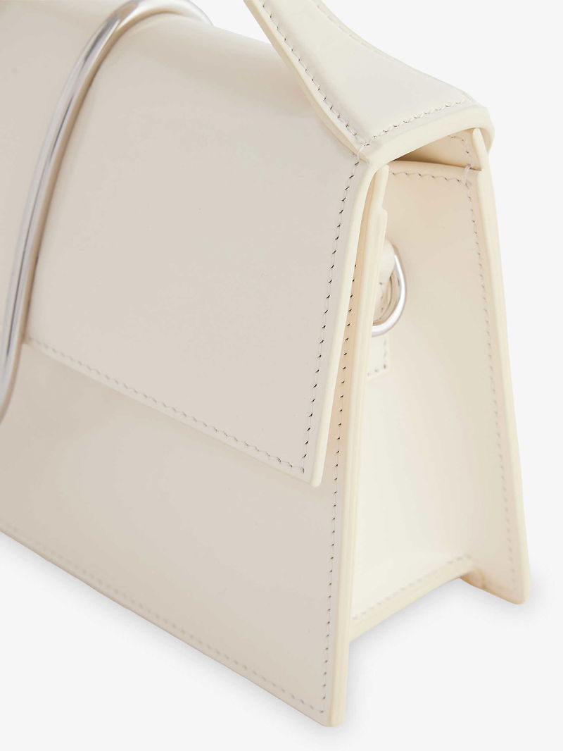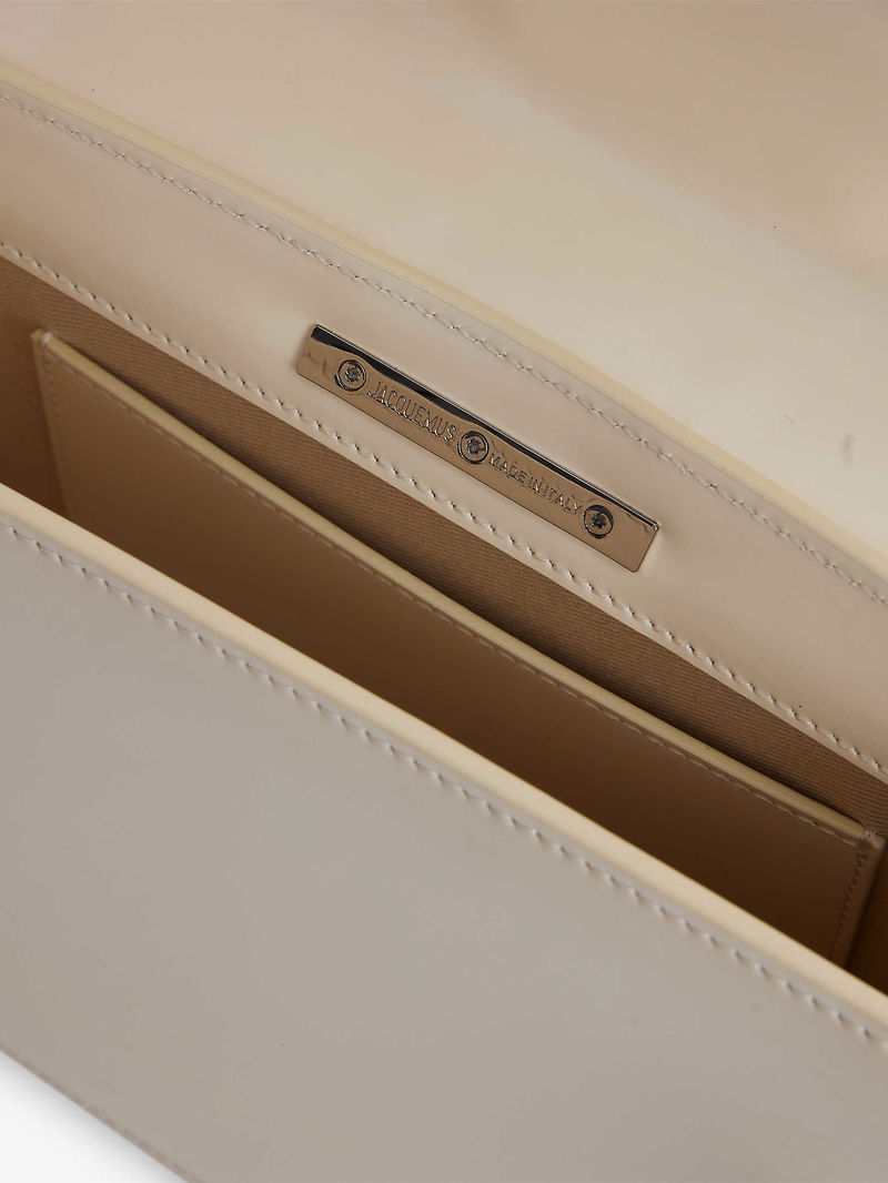 Jacquemus leather top handle bag. Rectangular shape, top handle, detachable adjustable strap, engraved metal at flap front, slip pocket and debossed branding at back, all-over smooth leather, silver-toned hardware, one main compartment, internal slip pocket, fully lined.