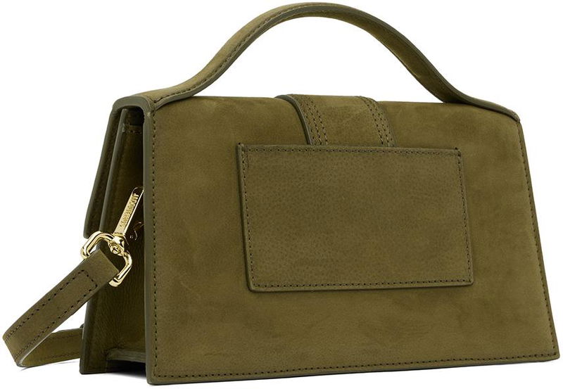 Grained leather top handle bag in khaki. Logo hardware at face.· Fixed carry handle· Detachable and adjustable shoulder strap· Patch pocket at back face· Foldover flap · Twill lining in beige·