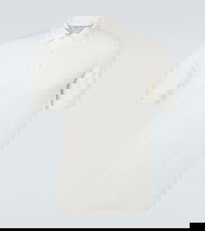 Knit cotton polo. Jacquard stripe trim throughout. · Rib knit spread collar, hem, and cuffs· Rib knit stripes at front and sleeve· Concealed three-button placket· Logo locker loop at back collar.