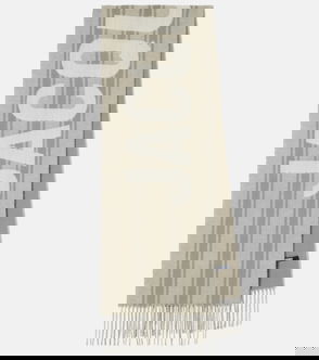 Rectangular brushed virgin wool flannel scarf in black. · Jacquard logo at face· Fringed detailing at ends·