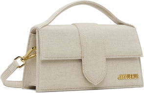 Water-repellent nubuck shoulder bag in beige.· Padded carry handle· Adjustable and detachable shoulder strap· Logo hardware at face· Card slot at back face· Magnetic flap· Card slot at interior· Cotton twill lining· Logo-engraved gold-tone hardware