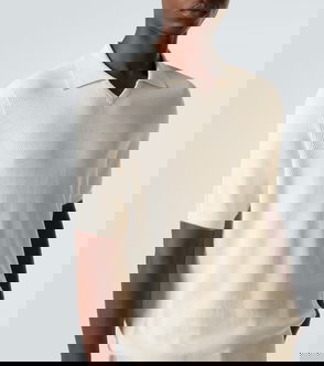Cable knit stretch viscose polo.· Rib knit spread collar, hem, and cuffs· Three-button placket· Jacquard stripe at hem· D-ring at back collar· Corozo hardware. Part of the Les Sculptures collection.