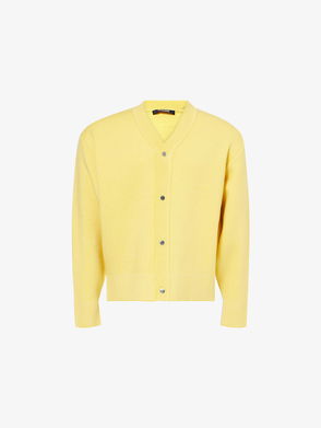 Knit stretch nylon-blend cardigan. Pleats throughout.· V-neck· Button closure· Jacquard stripe at cropped hem· Dropped shoulders· Locker loop at back collar· Mother-of-pearl hardware. Part of the Les Sculptures collection.
