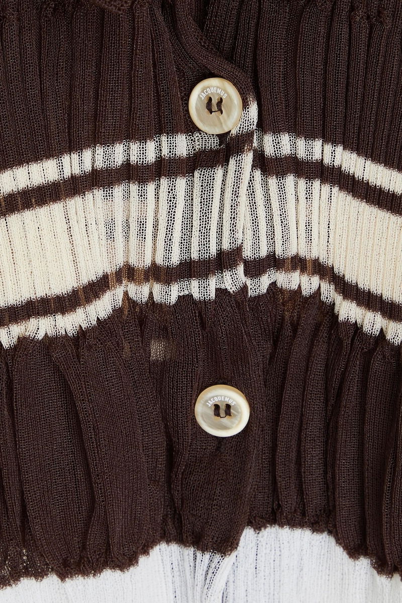Shirt, Striped, Ribbed-knit, Ruffled, Button fastenings through front, Stretchy fabric, Mid-weight fabric.
