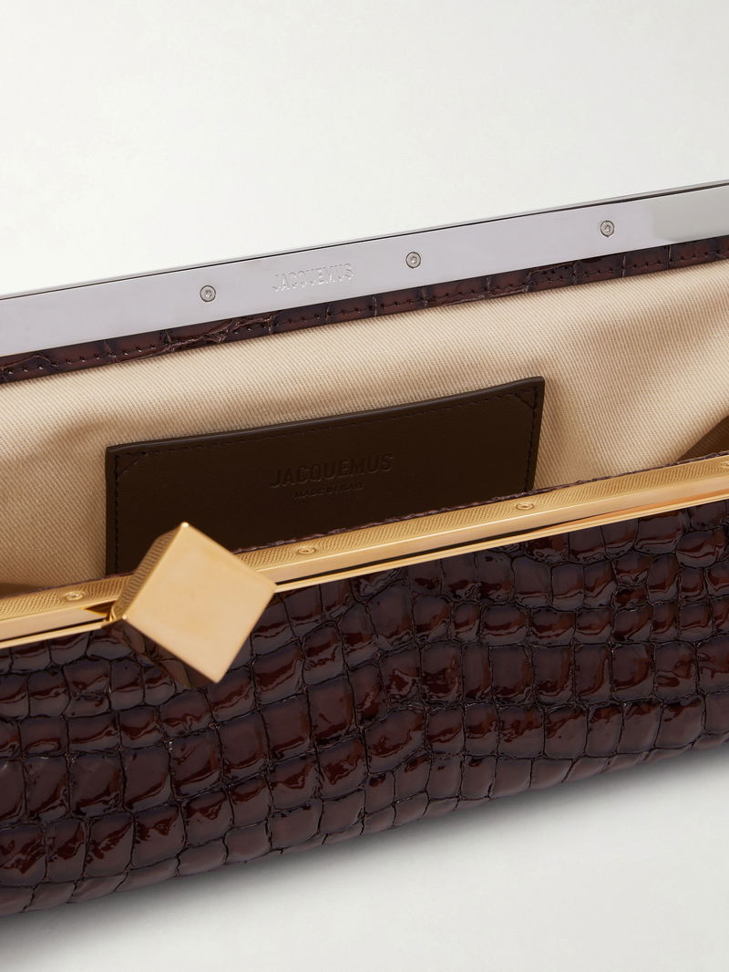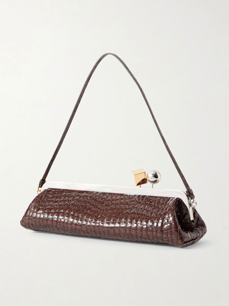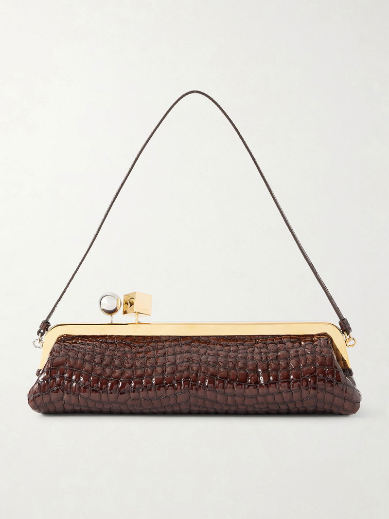 The elongated shape of Jacquemus' 'Salon' clutch is so elegant. It's made from gleaming croc-effect patent-leather with a gold-tone frame and slim leather strap.