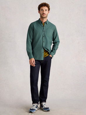 The shirt includes a breast pocket and patch pockets for added functionality. The brand's logo is displayed at the back label, adding a touch of subtle branding.