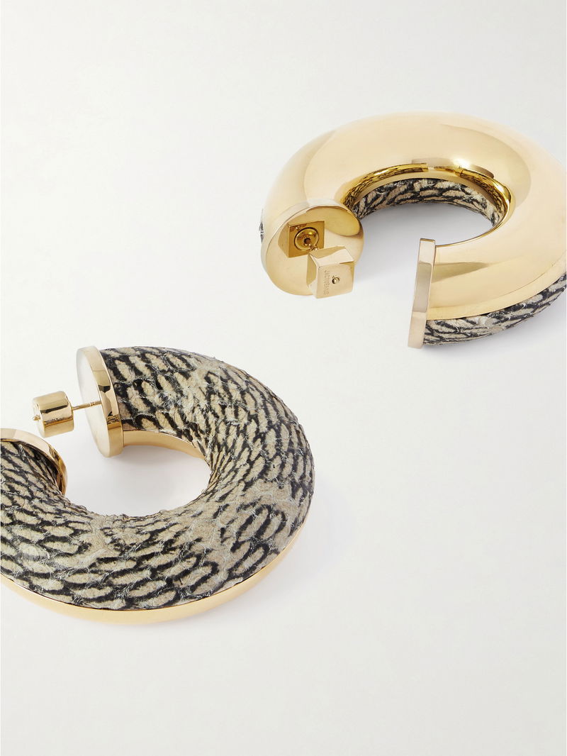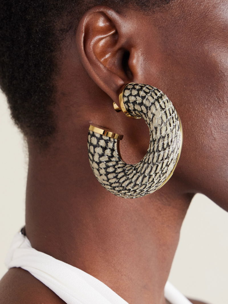 Inspired by mid-century French couture and American fashion, Jacquemus’ Spring '25 'LA CROISIÈRE' collection plays with sculptural silhouettes and nostalgic glamour. These 'The Mojave' earrings are made from gold-tone metal in a chunky shape with snake-effect leather on one side.