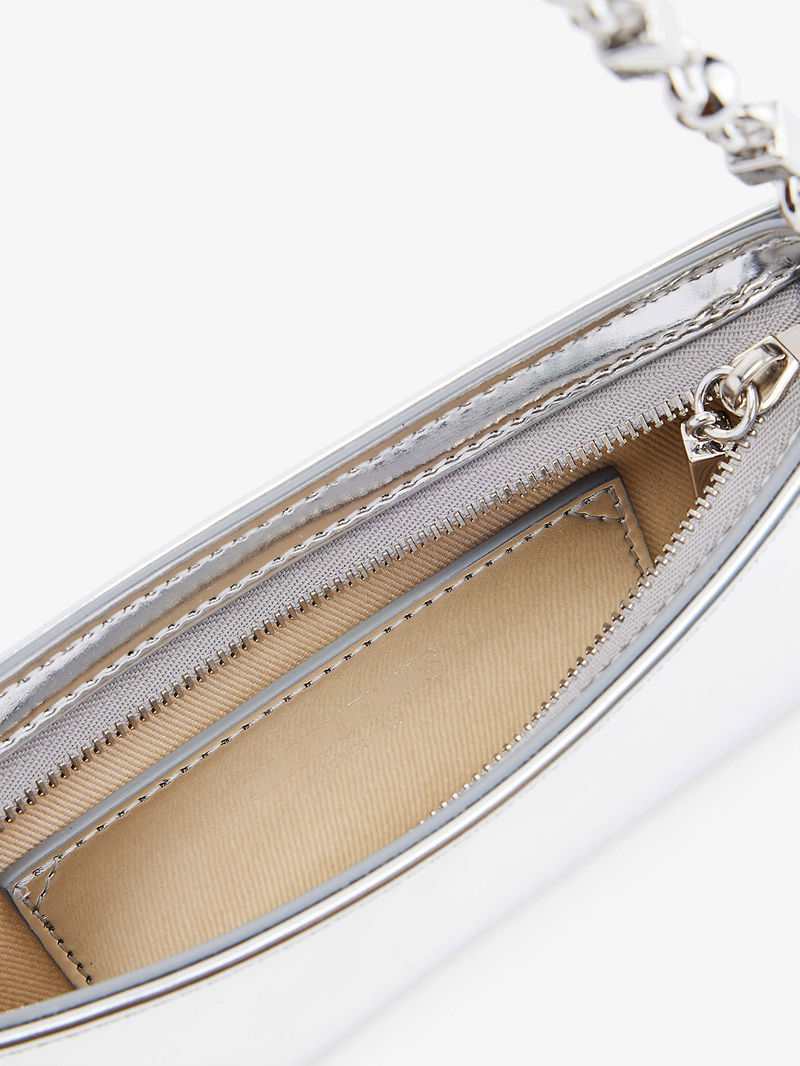 • Curved shape, chain strap, logo at front, main compartment, fully lined