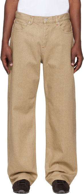 Straight-leg overdyed non-stretch denim jeans. Fading throughout. · Mid-rise· Belt loops· Five-pocket styling· Button fly· Leather logo patch at back waistband.