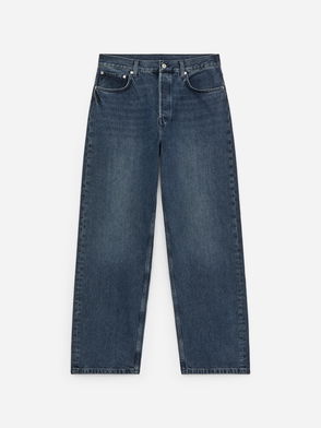 Straight wide-leg overdyed non-stretch denim jeans. Subtle fading throughout.· Mid-rise· Belt loops· Five-pocket styling· Button fly· Leather logo patch at back waistband· Logo-engraved gold-tone hardware.
