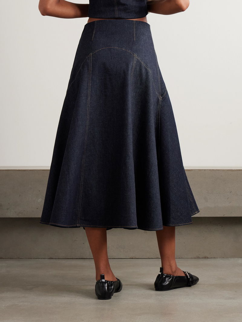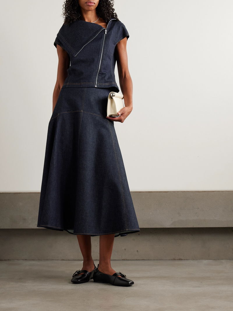 The curved yoke of Jacquemus' skirt feels distinctive to the French label, which favors modern, geometric lines. It's tailored from denim that's blended with a hint of stretch and cashmere, and embroidered with a tiny 'J' at the side. Style yours with knee boots vanishing under the hem.