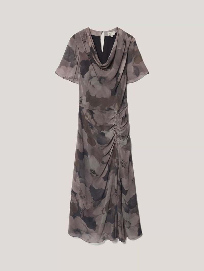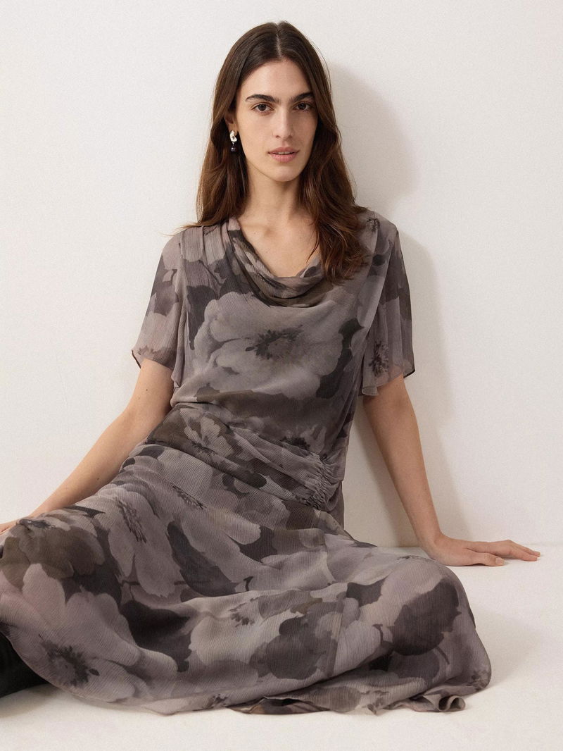 Embodying beautiful fluidity with a cowl neckline and floaty sleeves, this piece also has a shirred panel at the back for comfortable sitting.