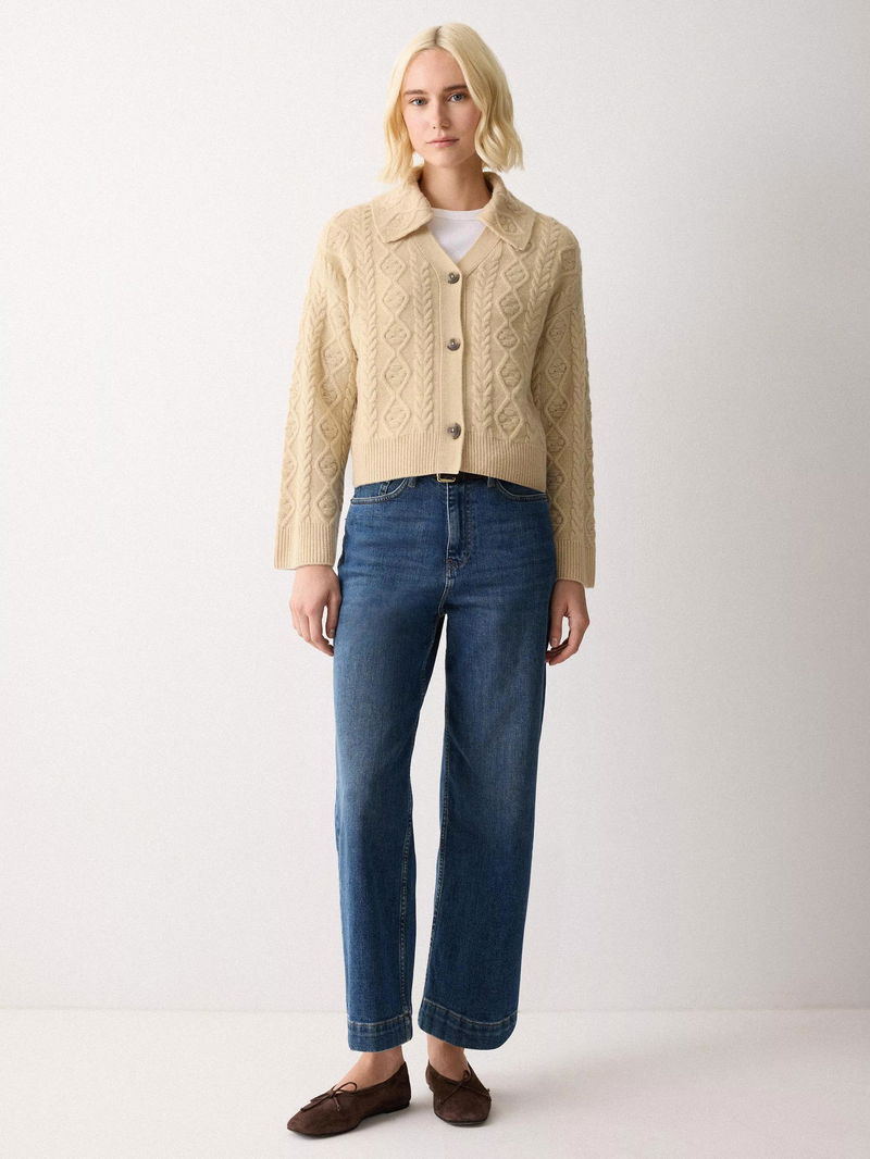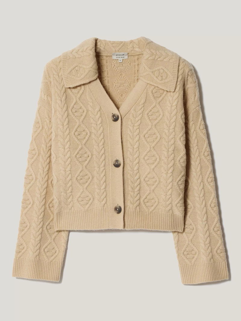 Knitted from a wool-rich blend, this Cable Cardigan is an easy-wearing piece. Featuring horn buttons, a button-front and collar detail, this is a true love forever piece.