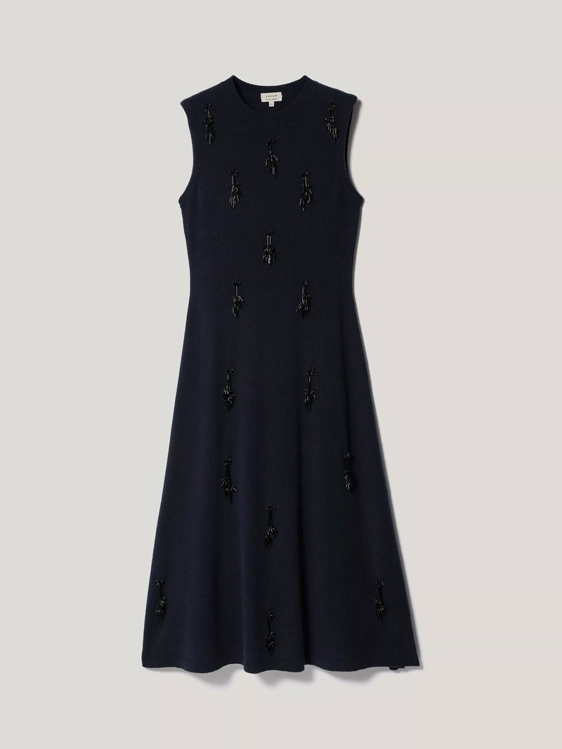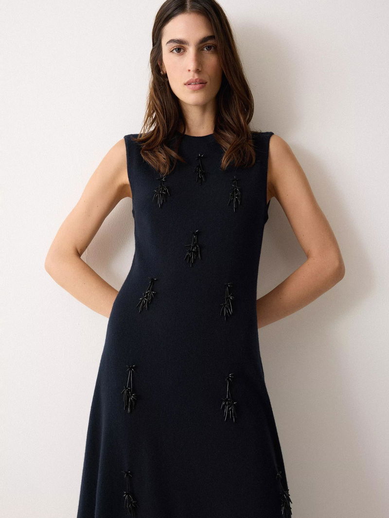 The round neckline and nipped-in waist create a clean, feminine silhouette, while bead embellishment on the front adds a textural finish.
