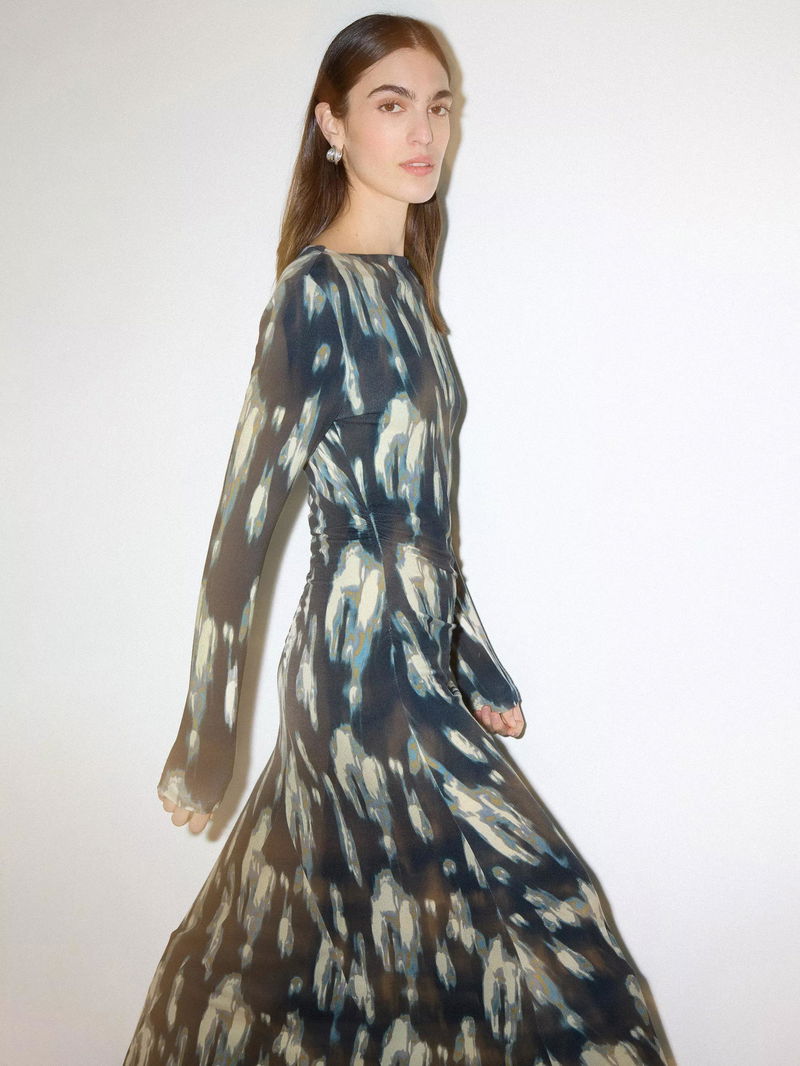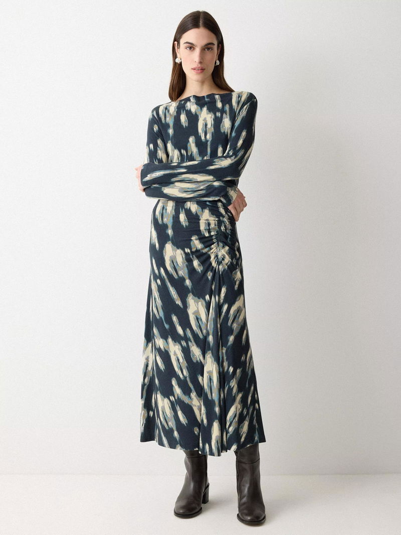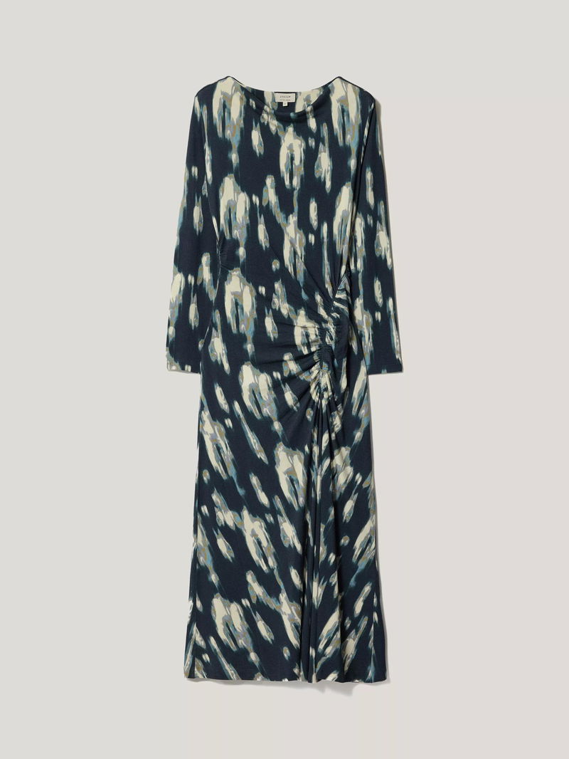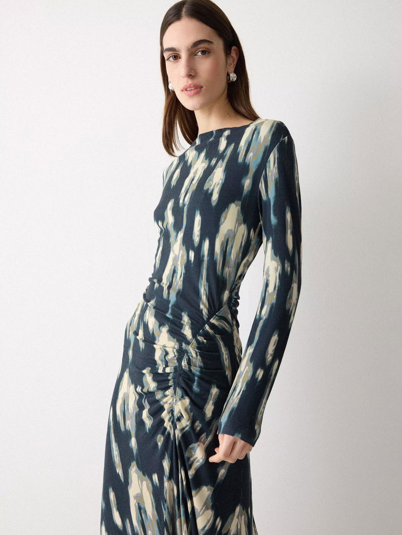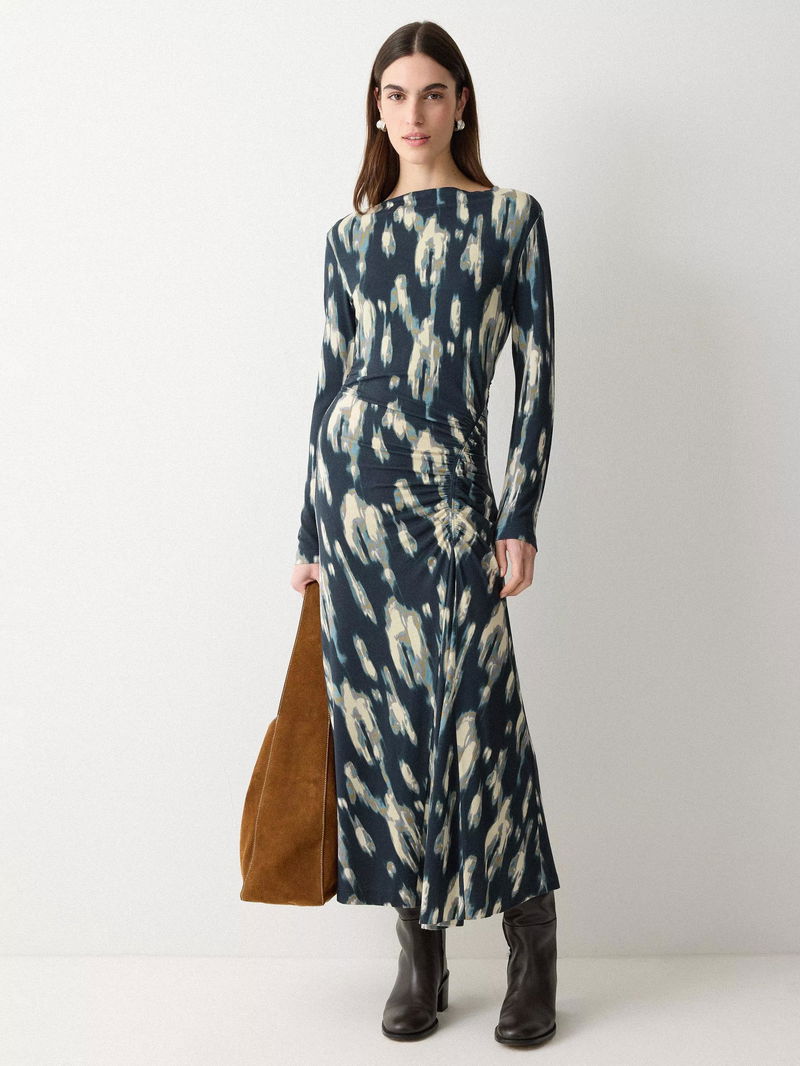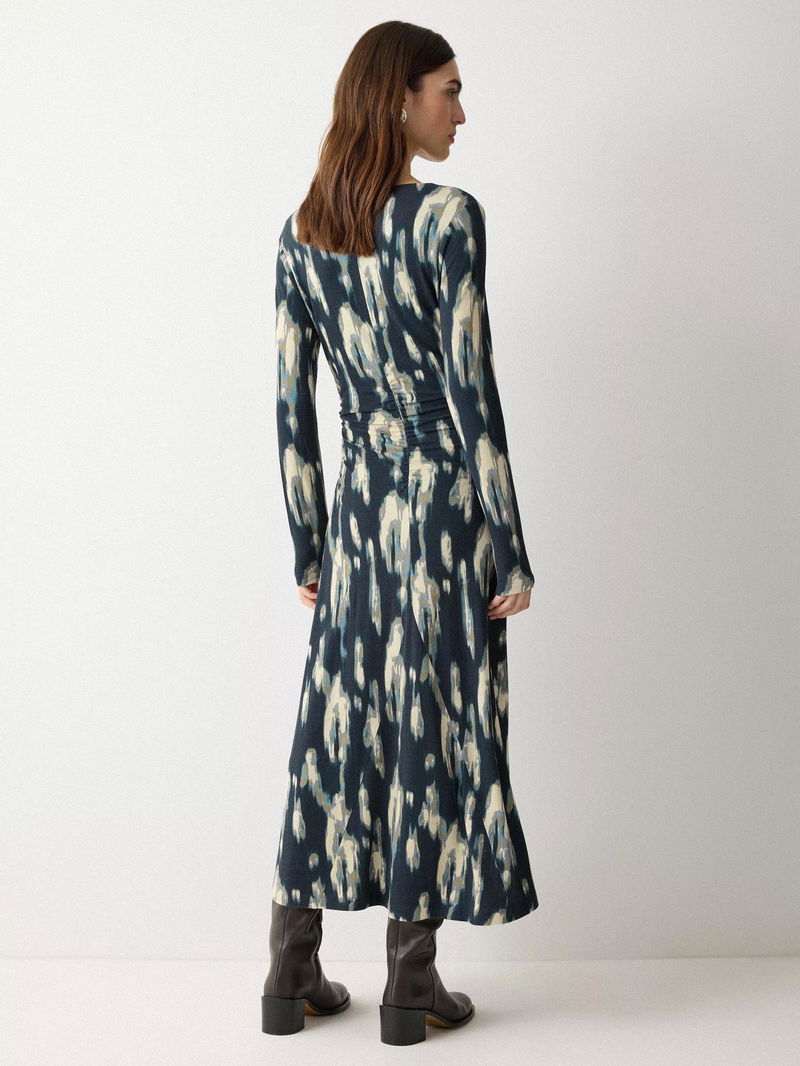 Crafted from exceptionally soft jersey, the Ikat Ruched Jersey Dress is a celebration of artful design and effortless comfort. The striking ikat pattern has been designed in-house, while thoughtful ruched detailing creates a flattering and feminine fit. For a relaxed daytime look, pair it with simple leather sandals, or elevate it for evening with heeled boots and delicate gold jewellery.