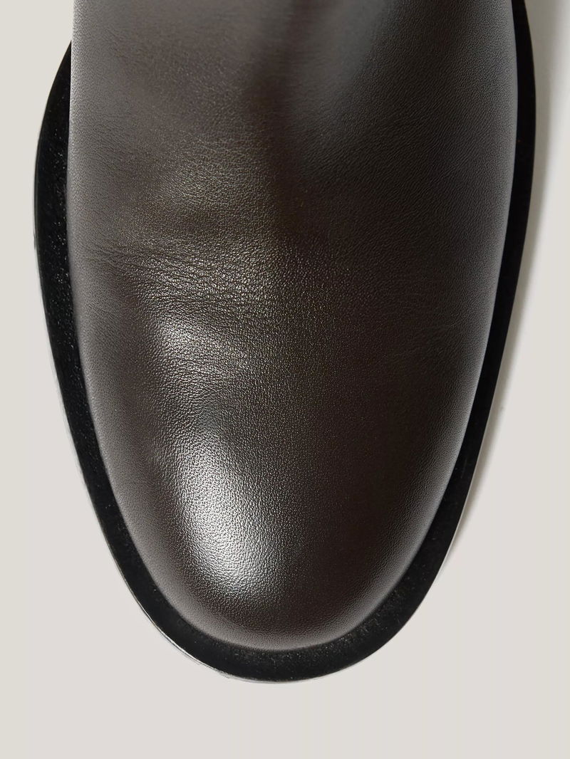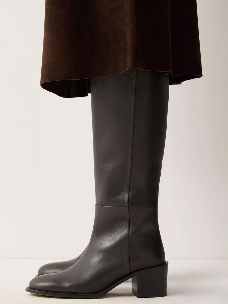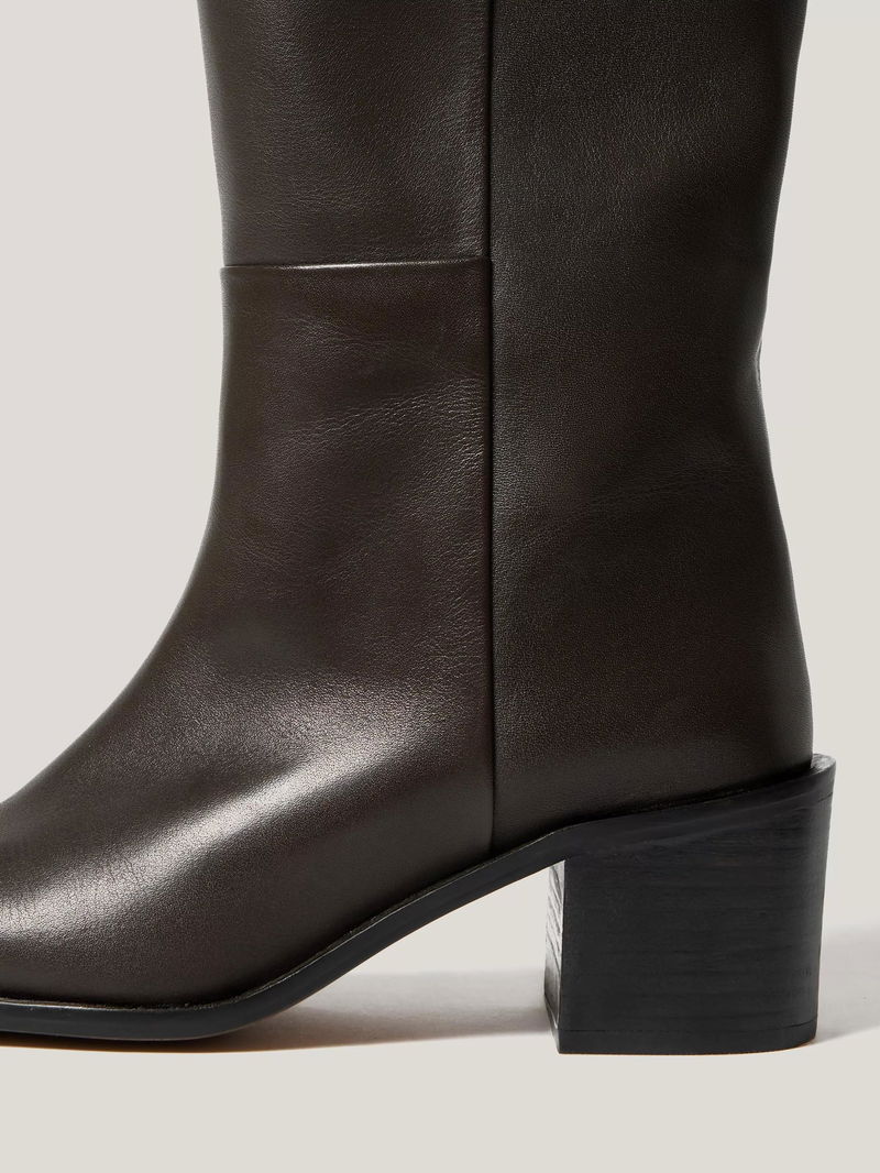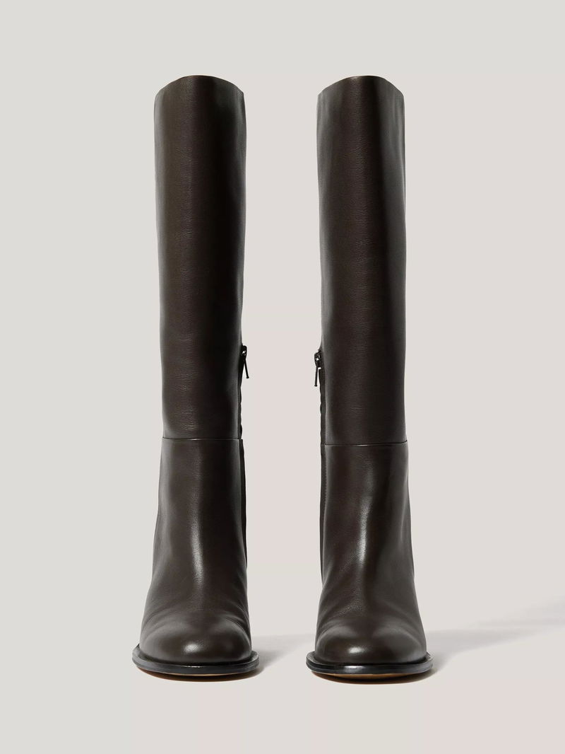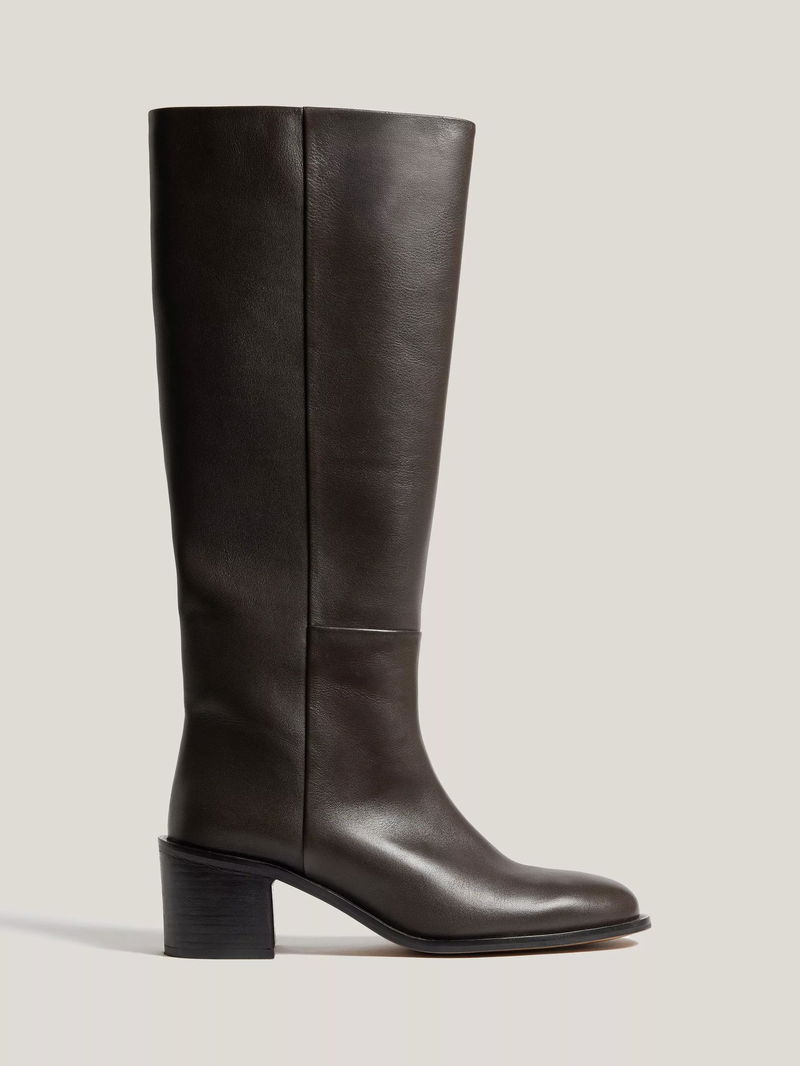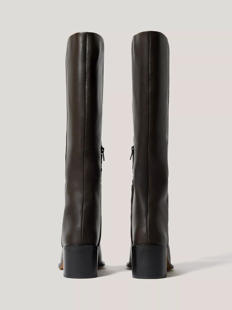 The classic riding boot reaches new heights with this chunky block heel design. Crafted from super-soft calf leather with a size zip fastening and a sleek almond toe, wear for an equestrian-inspired finish to any day or night look.