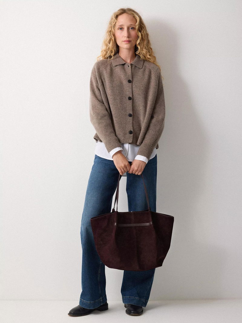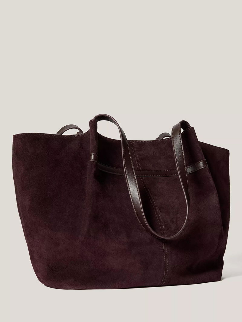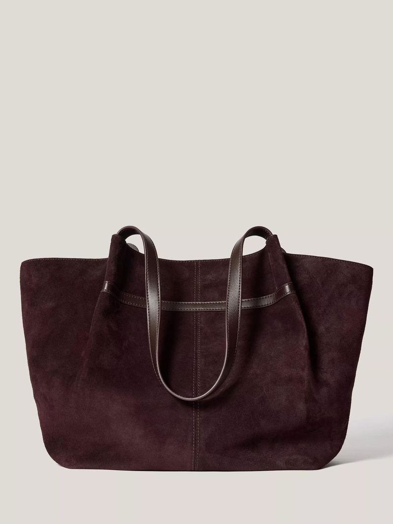 A suede shopper bag with leather straps and contrast stitching. The perfect size to see you from work to weekend.