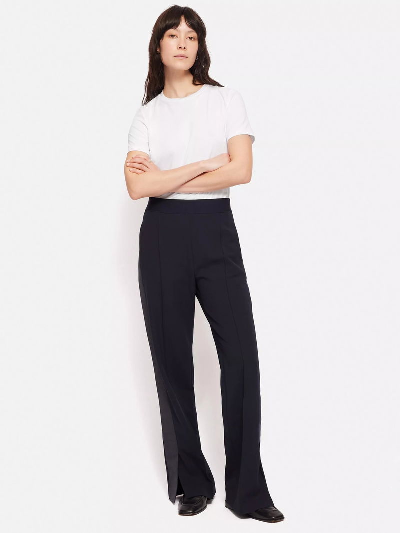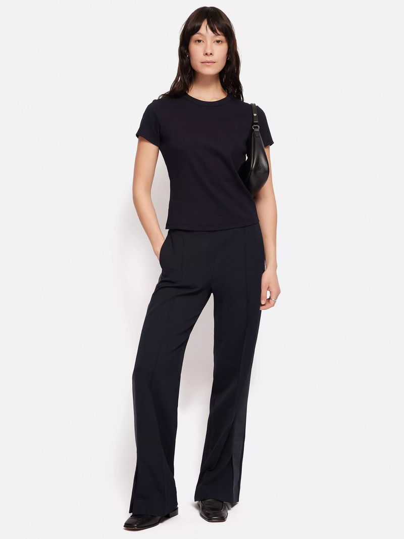 A pair of flared leg joggers by Jigsaw. They are designed to sit mid rise with a zip fastening and split hems that fall to a regular length.