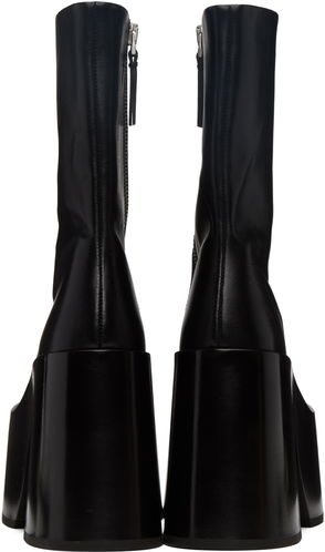Mid-calf buffed leather and semi-sheer stretch nylon jersey sock-style boots.· Pointed toe· Pin-buckle ankle strap· Padded leather footbed· Covered kitten heel with rubber injection· Leather sole.