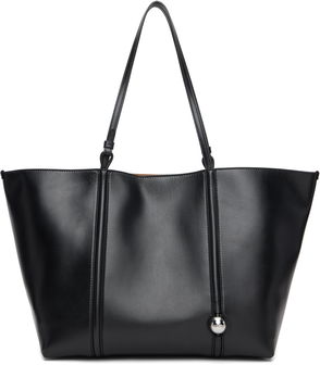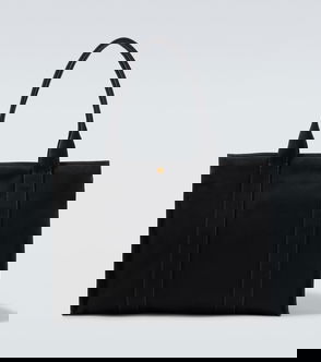 Cotton- and linen-blend canvas tote in black. Twin leather shoulder straps. Logo printed at face. Open throat. Patch pocket and card slots at interior. Unlined.