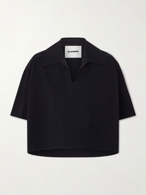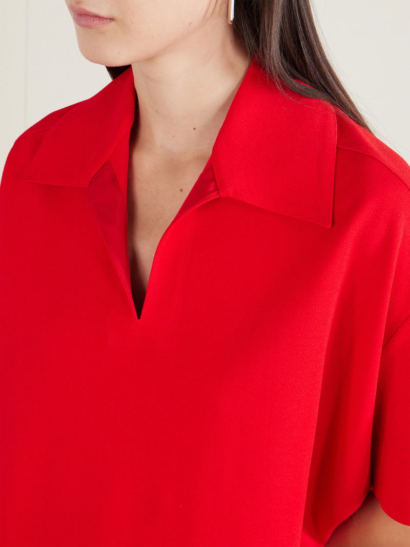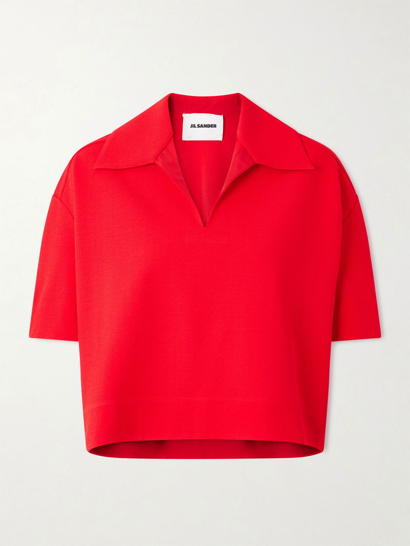 Jil Sander's shirt has a boxy, cropped shape that looks best styled with a high-waisted skirt or jeans. It's made from crepe in a bold red shade and has a relaxed polo collar and dropped shoulder seams.