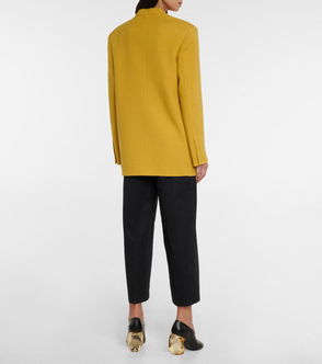 Jil Sander's black blazer is cut without lapels for a streamlined sensibility – note how the felted undercollar is left to heighten the deconstructed aesthetic. Crafted from wool serge for a matte finish, it has architectural roped shoulders that are balanced by a cutaway front, then is accented with welted hip pockets.
