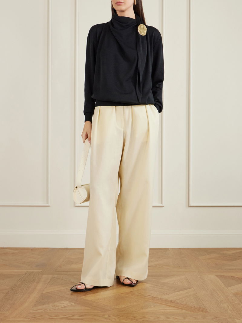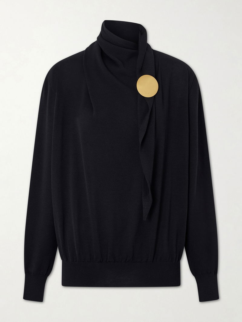 Knitwear is given a new lease of life in the hands of Jil Sander. Made from pure wool, this sweater is wrapped with a scarf and embellished with an abstract gold-tone brooch. It's designed for a relaxed fit so you'll look effortlessly put together.