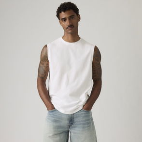 Non-stretch denim tank top. · Crewneck · Logo embossed at chest · Zip vent at side seam and shoulder.