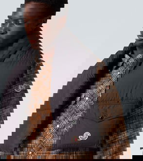 Down-filled quilted nylon taffeta scarf in beige · Integrated hood with drawstring and zip collar.