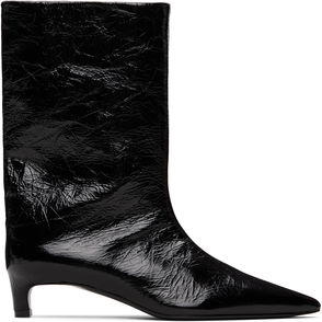 Knee-high polished calfskin boots in black.· Pull-loop at heel collar· Grained sheepskin lining· Stacked leather heel with rubber injection· Leather sole.