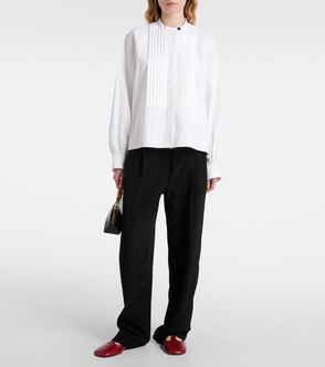 The feminine lines of corsetry serve as the inspiration for Jil Sander’s white Ninette top. It’s crafted in Italy from a linen-blend ripstop with a rounded neckline that cinches with slender ties, then finished with puff sleeves that elevate the romantic mood. Channel the label’s minimalist aesthetic by styling it with neutral separates.