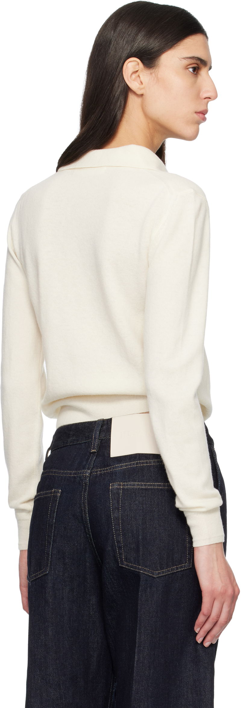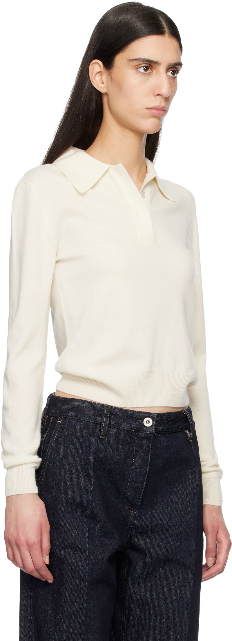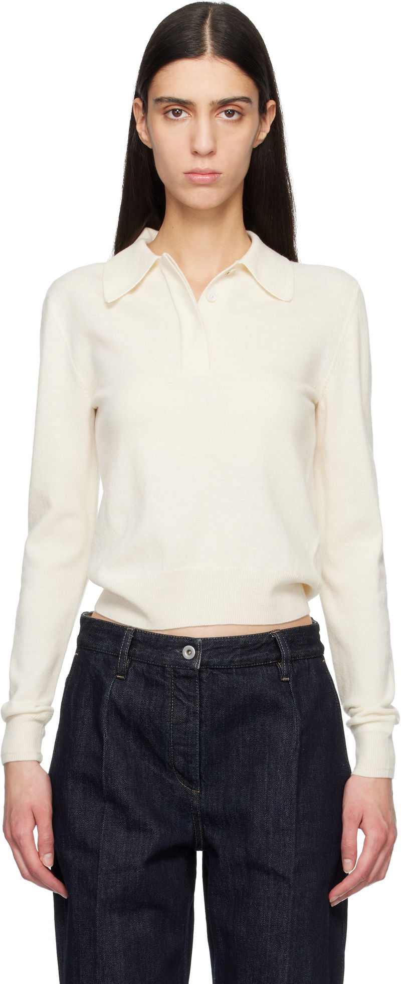 Knit virgin-wool polo. Spread collar. Concealed five-button placket. Rib-knit hem and cuffs.