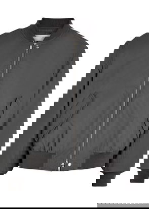 Padded recycled polyester gabardine bomber jacket. · Oversized· Rib-knit stand collar, hem, and cuffs· Two-way zip closure· Welt pockets· Dropped shoulders· Zip pocket at sleeve· Welt pockets at interior· Full viscose satin lining.