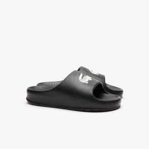 Buffed calfskin slip-on sandals in black. · Open square toe· Adjustable pin-buckle straps at vamp· Logo patch at molded goatskin footbed· Foam rubber midsole· Lugged rubber outsole.