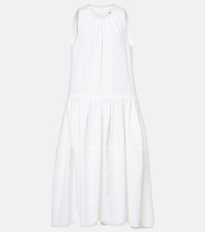Jil Sander crafts this white midi dress from cotton ripstop that's blended with metallic fibres for a tactile finish. Italian made with curved elbow-length sleeves, the pintucked waistline is defined by a belt, while the banded hem and zipped placket is framed by black topstitching.