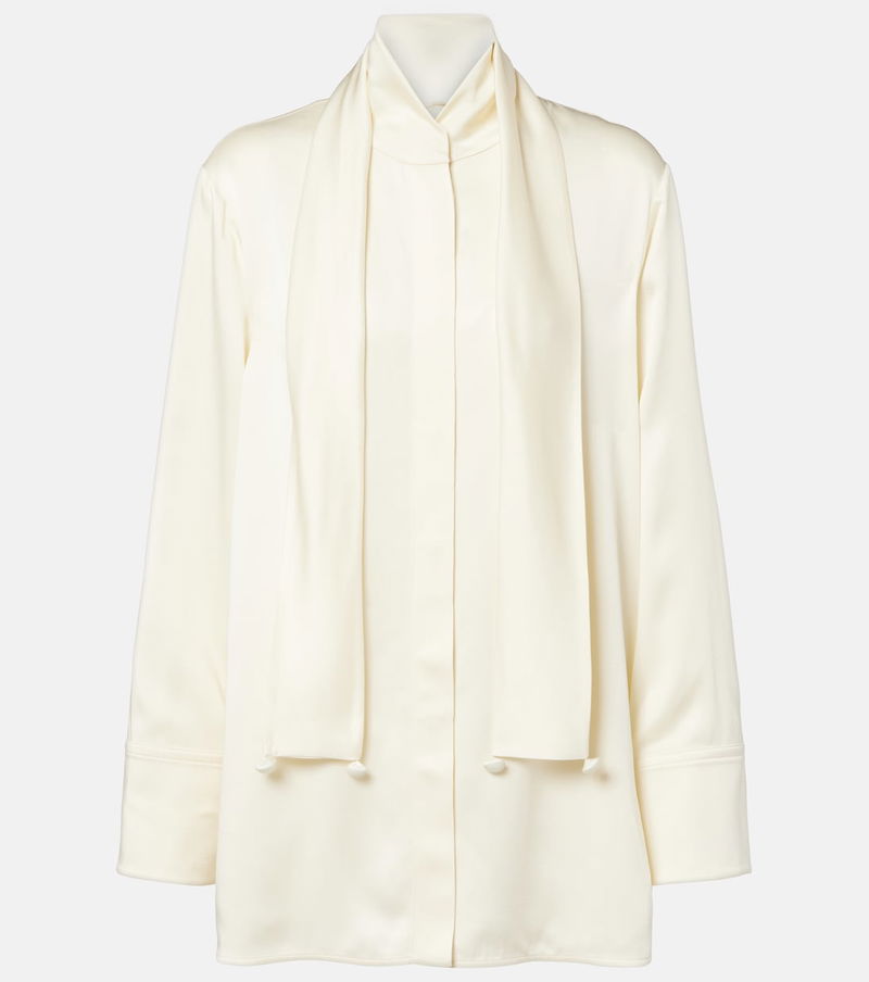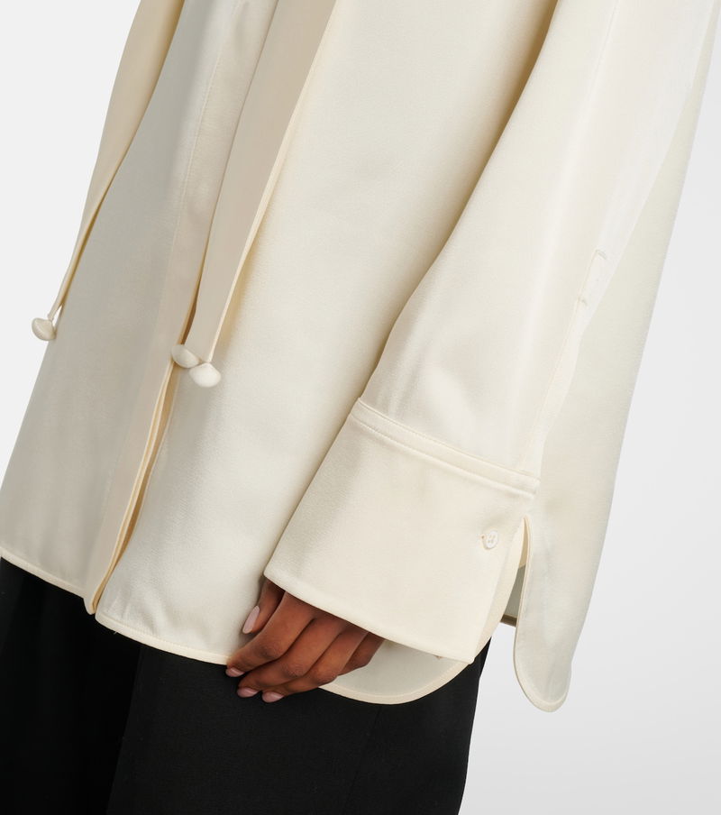 Jil Sander's sophisticated minimalism is characterized by neutral tones, clean lines, and precisely-placed details. Made from luminous satin, this shirt comes with a curved, high neckline and a removable scarf.
