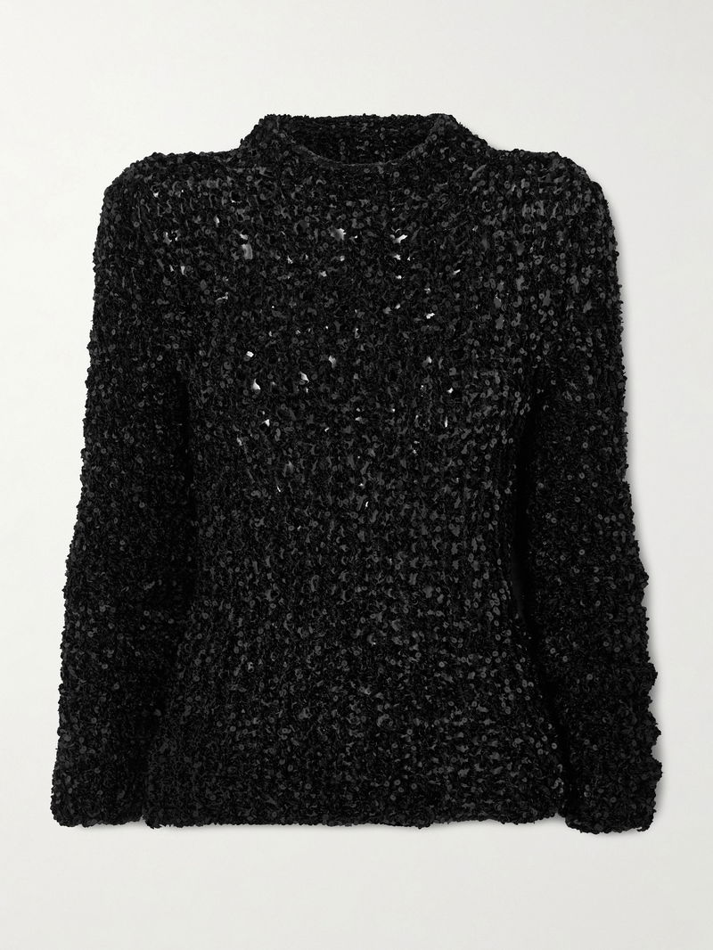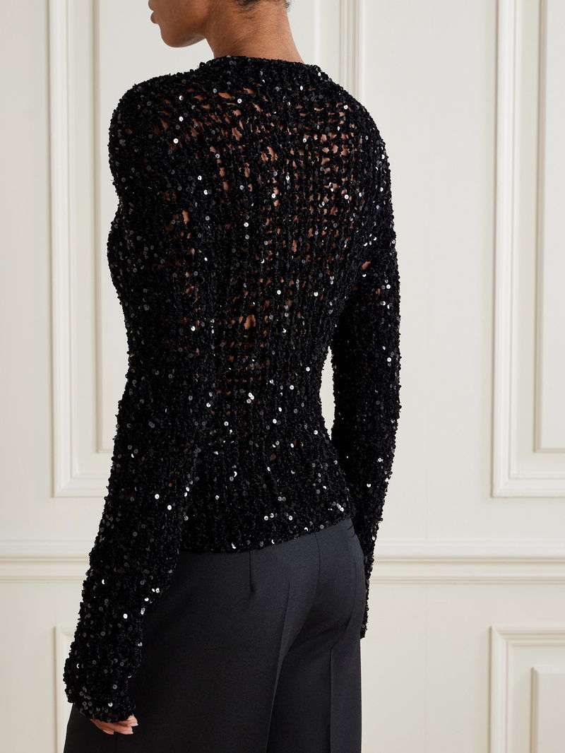 Jil Sander's sweater shimmers with sequins scattered across its surface. It's been knitted by hand in Italy in an open construction, revealing a glimpse of skin and whatever you choose to layer beneath it - try a tonal bralette or camisole.