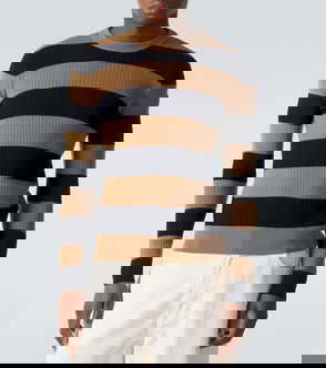 Long sleeve wool-blend jersey sweater in beige featuring stripe in purple at front. Rib knit crewneck collar, cuffs, and hem.