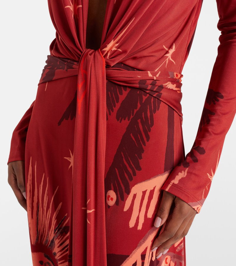 Johanna Ortiz based her eponymous brand in her hometown of Cali, Colombia, to celebrate its unique, colorful soul. This elegant midi gown is rendered in a red and orange print and boasts long sleeves.
