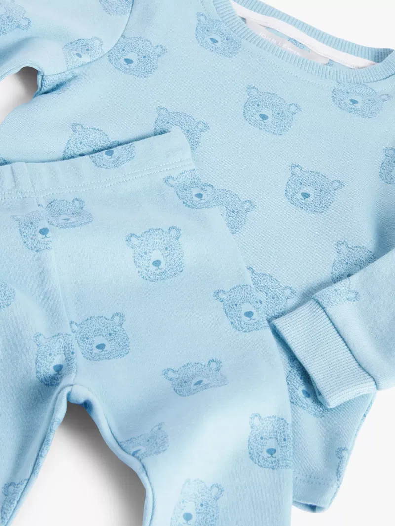 With an adorable bear print, these pyjamas from our collection make lounging cosy and cool at the same time. Made from pure cotton, they offer breathability and softness that both parents and little ones will love. The pyjamas feature a dropped shoulder sweater as well as a matching trouser with an elasticated, drawstring waist and ribbed cuffs for a great fit that keeps the warmth in.