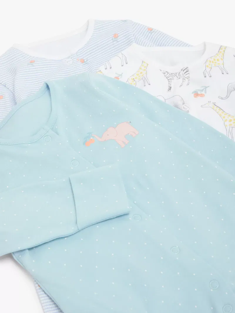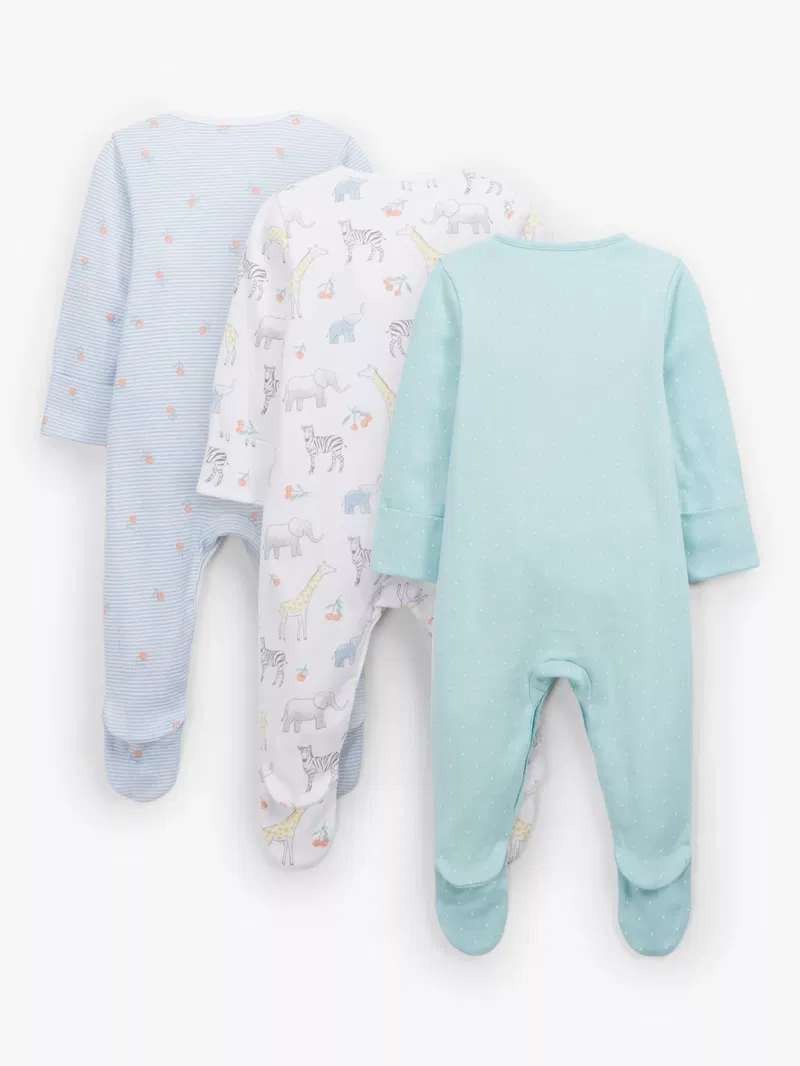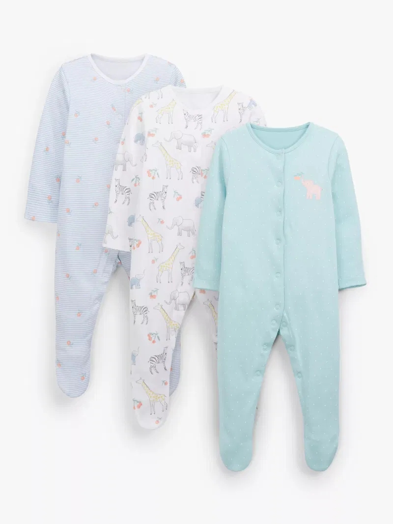 Opt for cute prints and calming colour palettes with this pack of three sleepsuits from our collection. Comfy against baby's skin and easy to get on (especially during the night) the ribbed collar adds a sweet finish and sits comfortably on baby's neck throughout their sleep. Choose from friendly safari animals, classic pin spots or pretty fruit motifs.