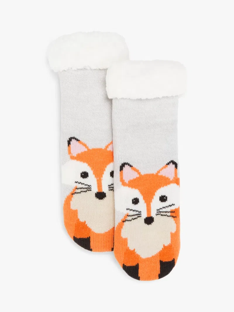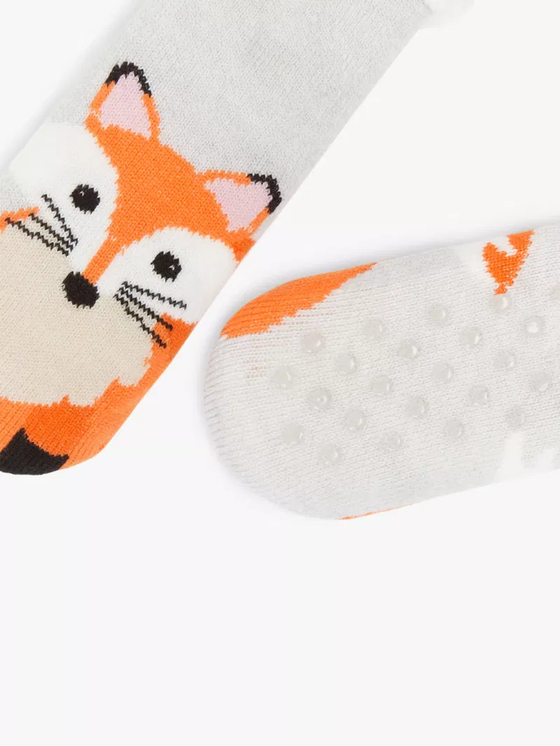 With a super-soft lining these cute Fox ankle-high socks will keep your toes toasty warm. The flat bobbles on the underside give them extra grip, turning them into slipper socks. One size fits all.