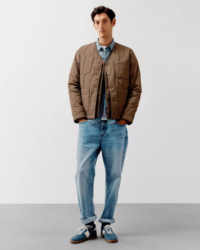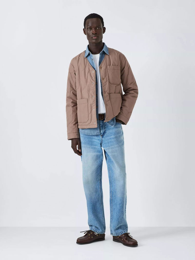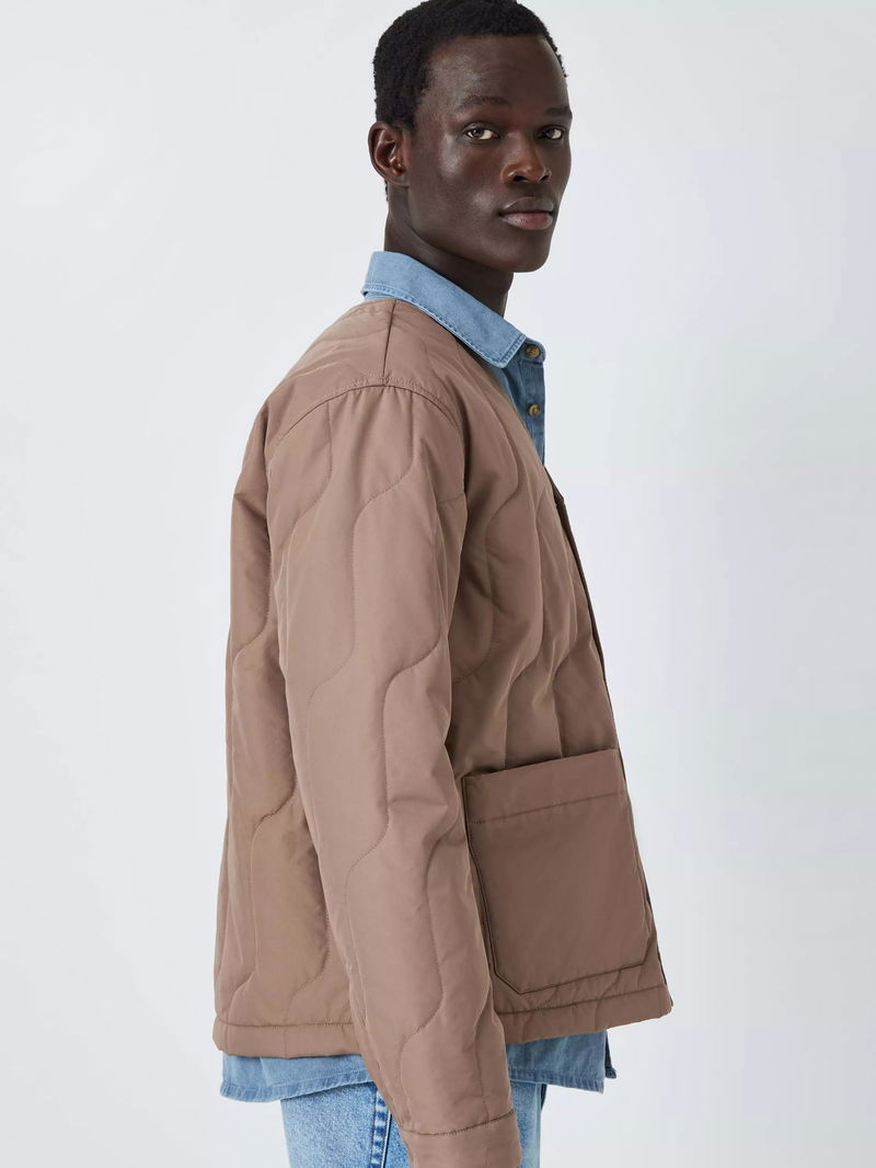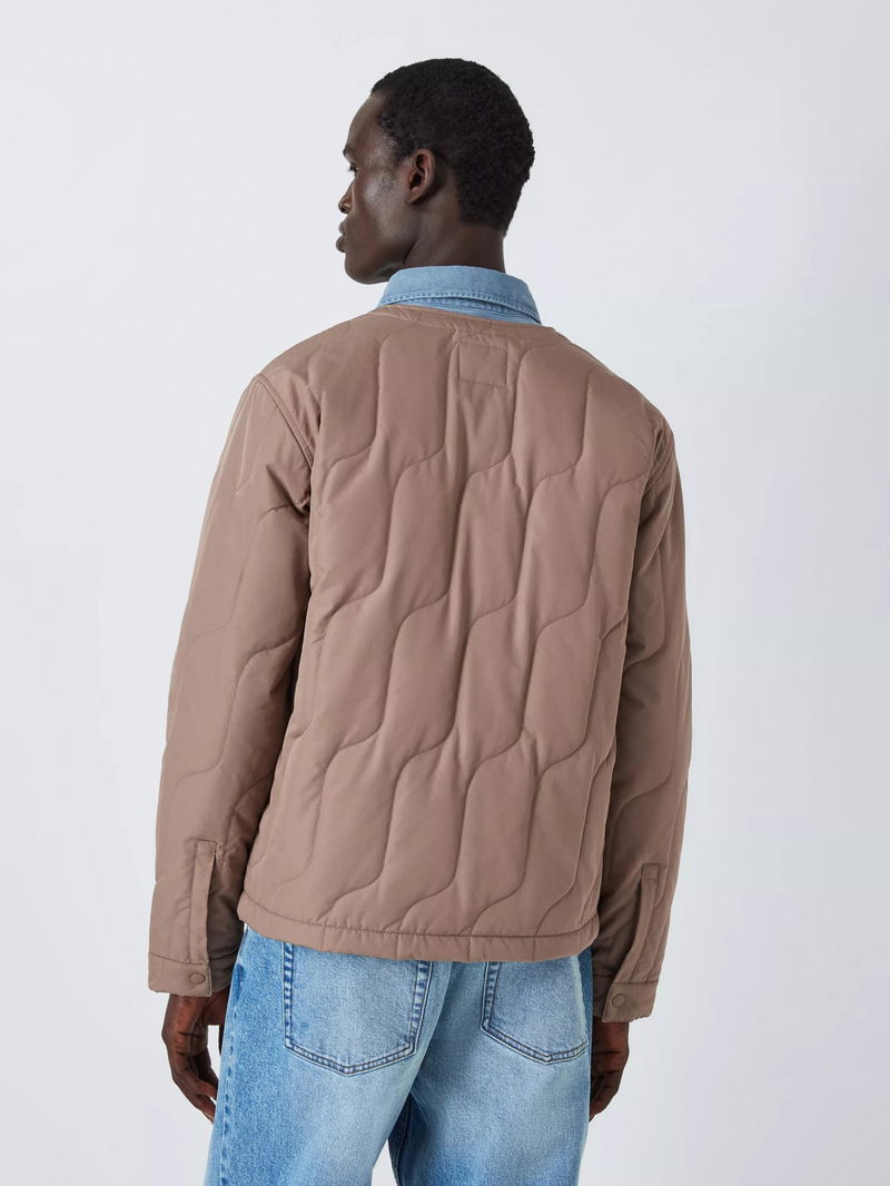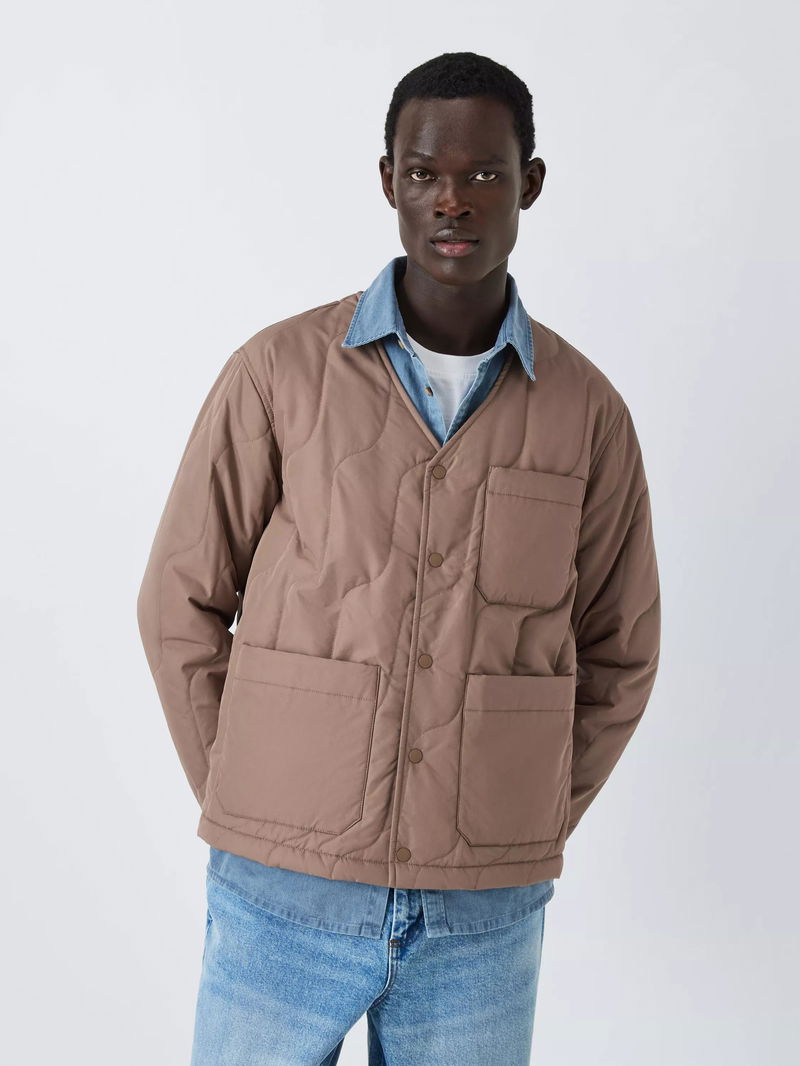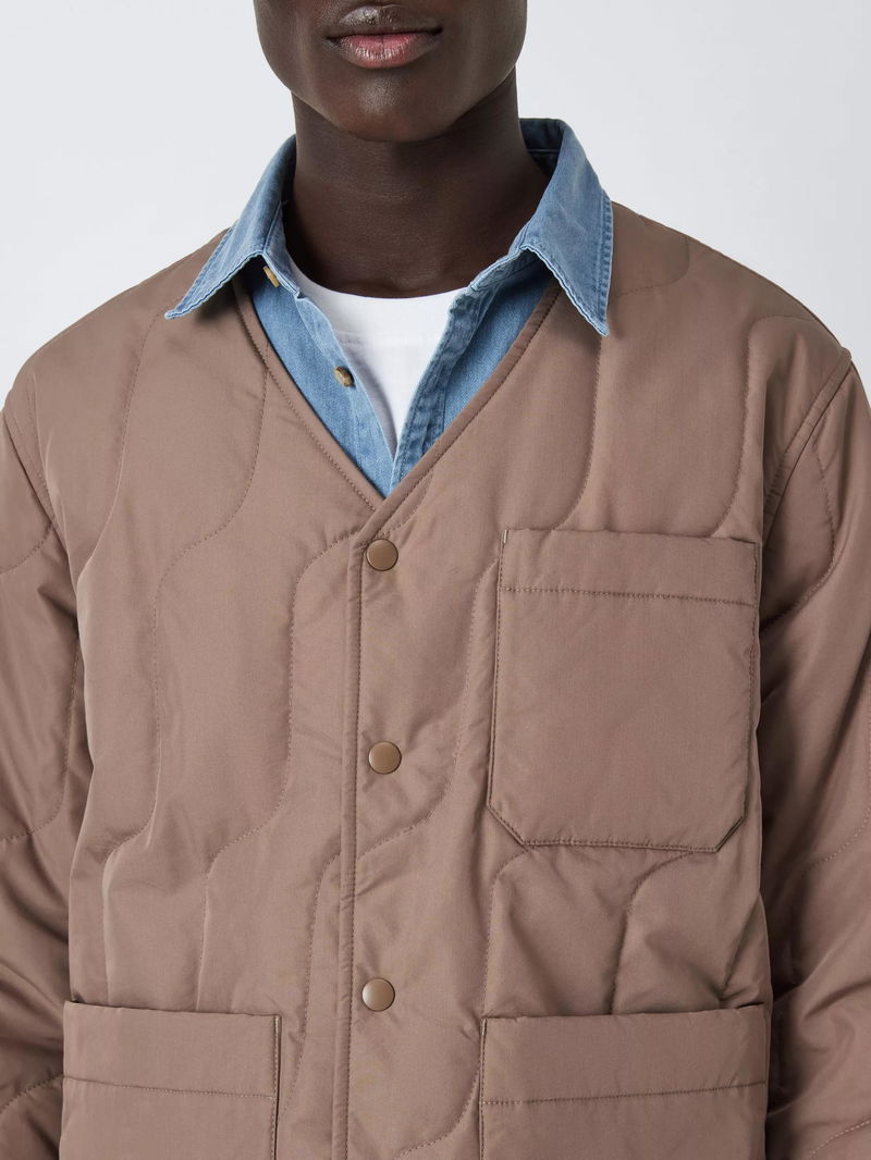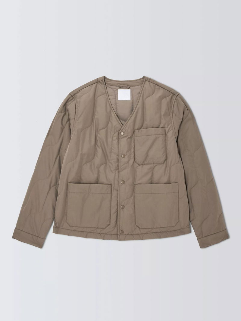 Wavy quilting adds lightweight warmth to this jacket, designed with two front utility-style patch pockets and one on the left chest. The Durable Water Repellent (DWR) coating ensures water resistance in light rainfall. Pick a favourite scarf to wear over the V-neckline on colder days and fasten with the popper buttons on the front. Made using recycled materials, helping us to reduce our impact on the planet.