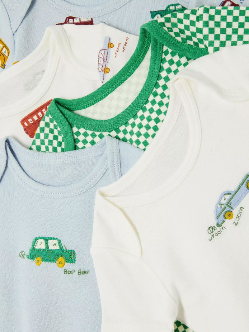Baby Car Check Short Sleeve Bodysuits, Pack Of 5, Blue Multi